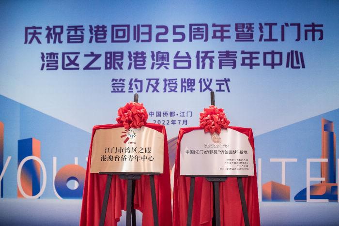 7月22日,慶祝香港回歸25周年暨江門(mén)市“灣區(qū)之眼”港澳臺(tái)僑青年中心簽約及授牌儀式,在中國(guó)鐵建江門(mén)鐵建城舉行。