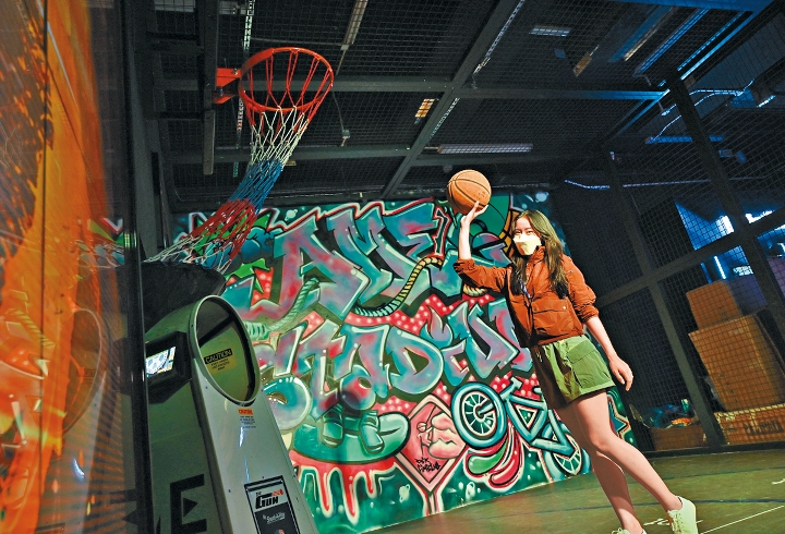 另一款很適合打卡的電競玩意便是籃球,在舉目盡是涂鴉的模擬“街場”,便有個電競籃球架。 游戲玩法簡單,先對準(zhǔn)籃球架兩側(cè)的屏幕射下不停移動的倍數(shù)分牌,再在場內(nèi)的一分區(qū)及三分區(qū),將實體籃球投入籃中,便可獲得射中倍數(shù)的分?jǐn)?shù),籃球迷不妨一試。