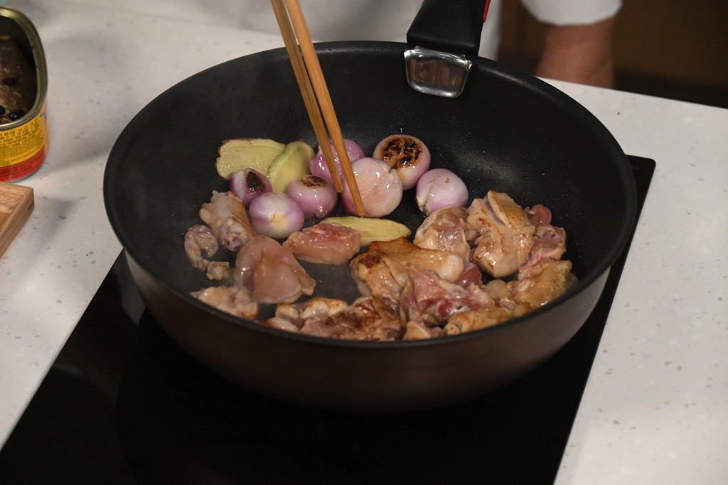 爆香的料頭放在鑊的一邊,加入雞件略為煎香。