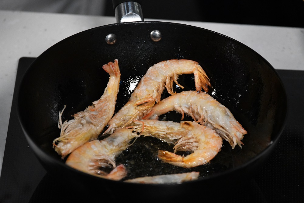 5. 鍋內(nèi)燒熱油,將蝦先半煎炸至金黃色,盛起。