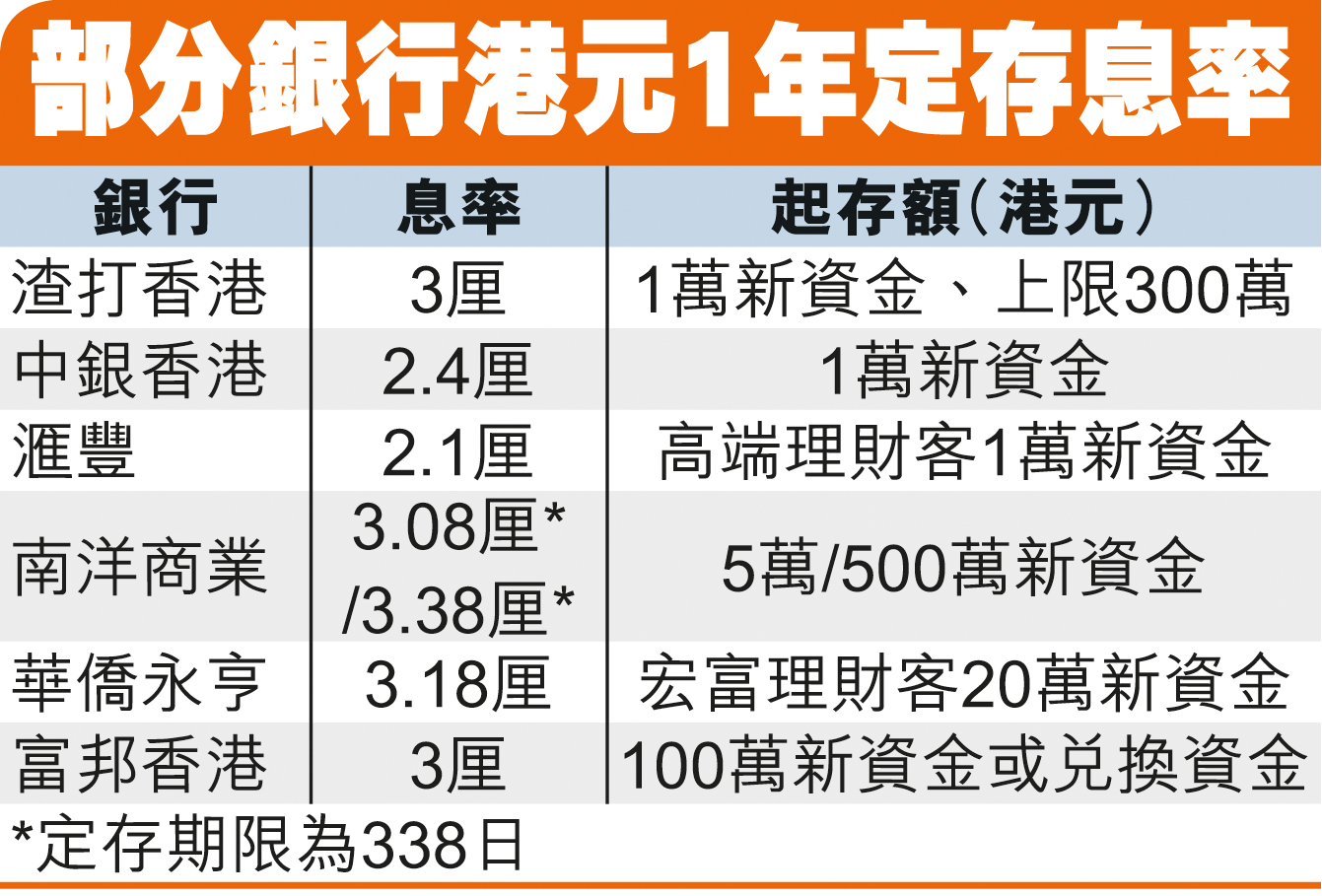 現(xiàn)有資金的一年定存息則維持不變,仍介乎2.7厘至2.9厘。