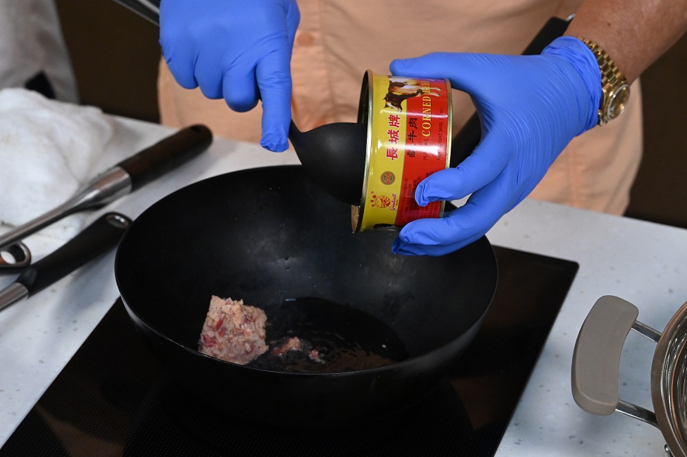 罐頭料理千變?nèi)f化,可發(fā)揮無限創(chuàng)意。例如這道“咸牛肉蒸粉包”,用腸粉包裹蔬菜及咸牛肉,口感豐富。