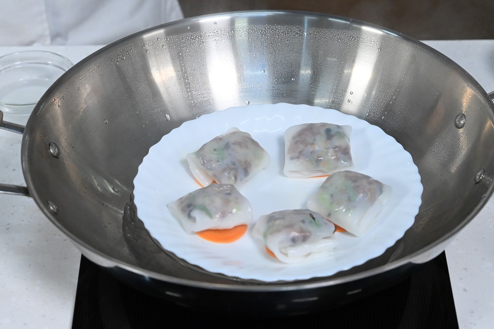 三姐利用齋腸粉包裹咸牛肉和蔬菜,變成相當(dāng)有創(chuàng)意的蒸粉包,美味可口。