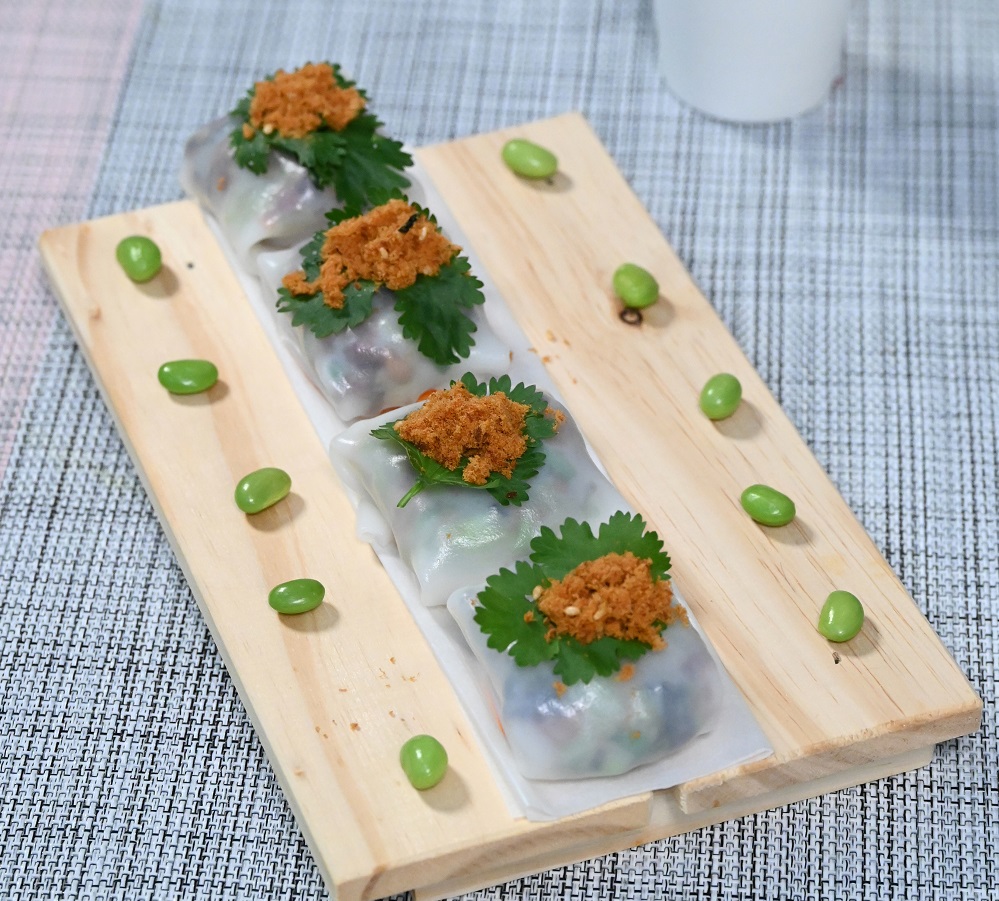 8. 將腸粉攤開,切成正方形加餡料包裹蒸2分鐘,用芫荽及魚松裝飾即成。