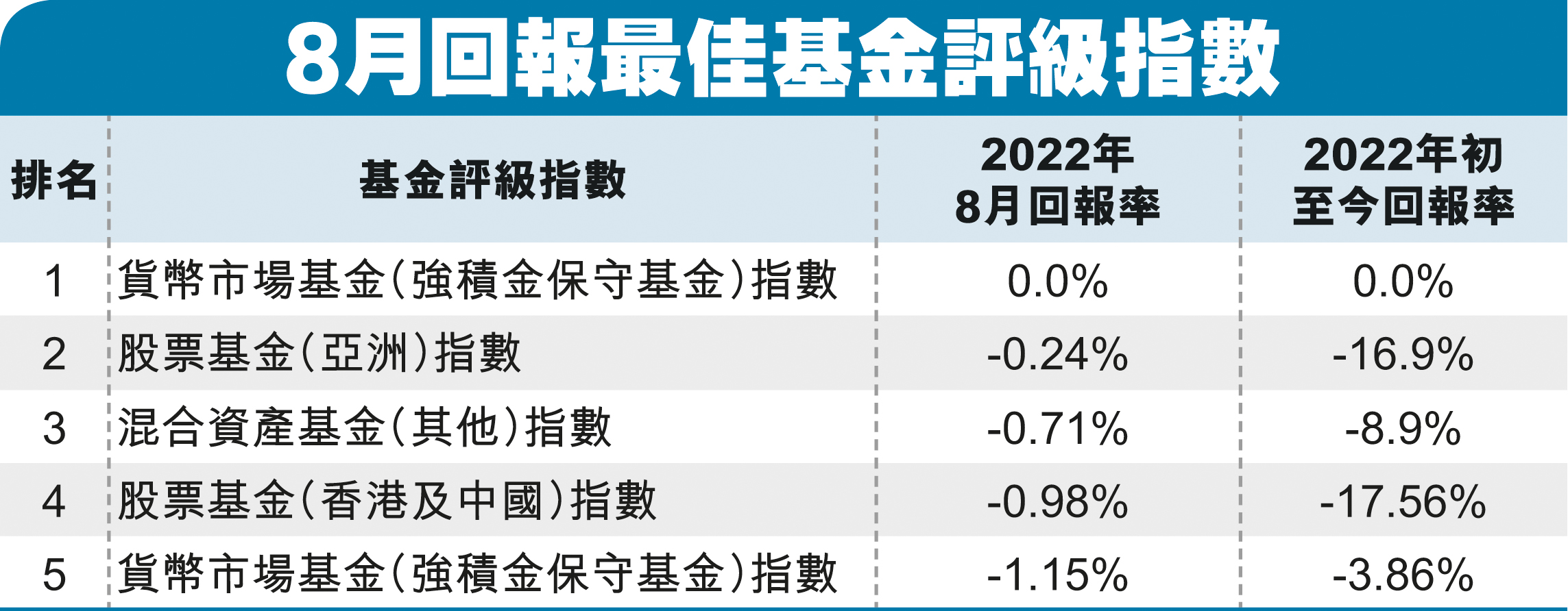 幾乎全部類型的強積金指數(shù)回報都在8月錄得負增長,自年初至今指數(shù)回報僅錄得零的貨幣市場基金(強積金保守基金),已是其中表現(xiàn)最好的類型。8月只有約10多只MPF基金能夠錄得正回報,滙豐及恒生旗下的亞太股票追蹤指數(shù)基金,8月都有輕微的0.16%正回報,竟已是全部逾400只MPF基金中最好的。