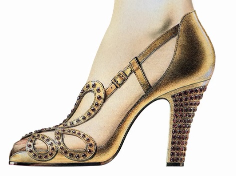 出自Mr. Roger Vivier手筆的鞋跟鑲嵌寶石的金色高跟鞋。
