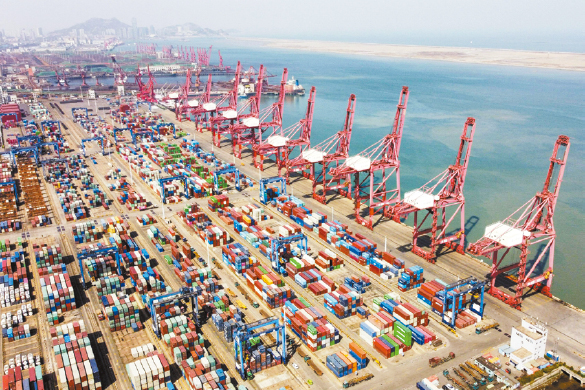 ▲中國經(jīng)濟“頂風(fēng)爬坡”,經(jīng)濟數(shù)據(jù)不容樂觀。圖為江蘇連云港貨柜碼頭起重機和貨柜的航拍照片。法新社資料圖片