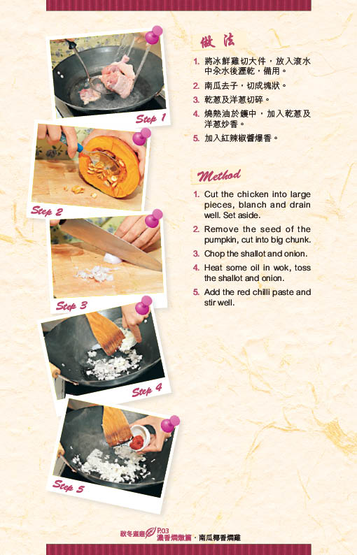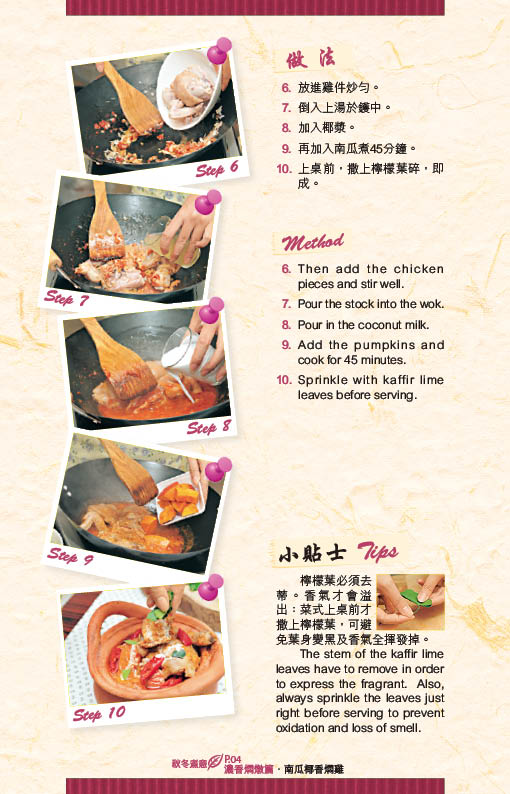 南瓜含豐富營養(yǎng)素,味道香甜,質(zhì)感綿密,用來炮制咸甜美食皆適宜。用南瓜燜雞,可為雞肉加添香甜味道。椰漿香濃稠滑,可令菜式更濃郁,豐富醬汁的味道和口感。
