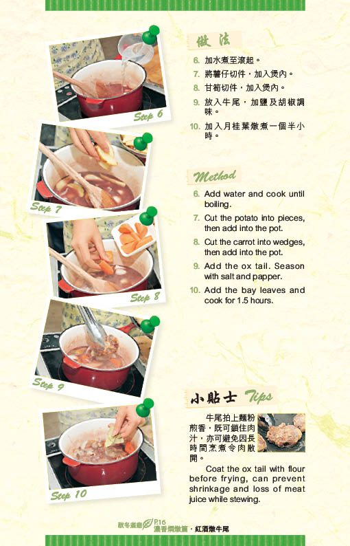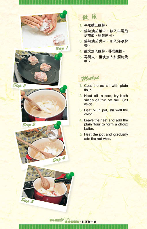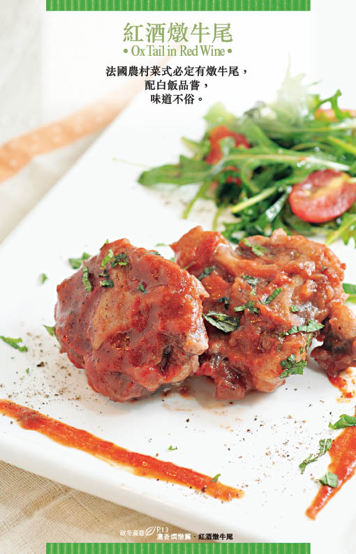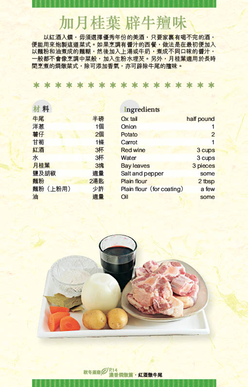 想燉牛尾的味道香濃鮮味,加入月桂葉可辟去羶味及添加香草氣息。以紅酒燉煮牛尾,特別對味,選用平價紅酒便可,母須選用貴價佳釀。