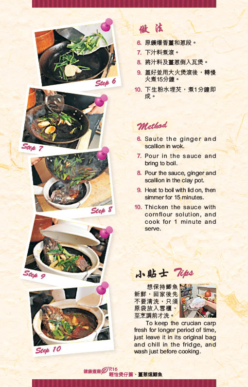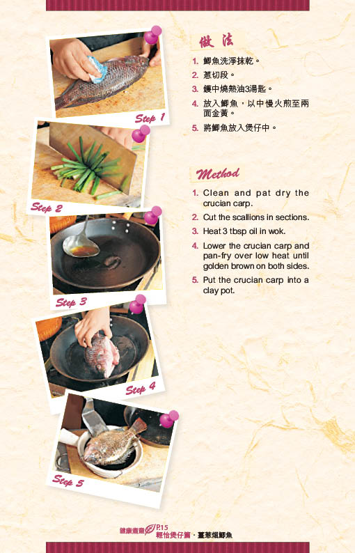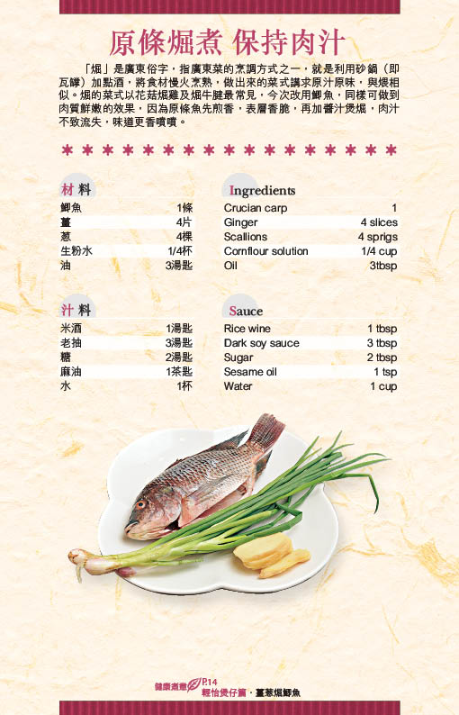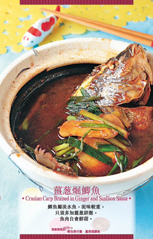 鯽魚含有優(yōu)質(zhì)蛋白質(zhì),以及豐富奧米加3,對腦部發(fā)展及眼睛均有益。鯽魚屬淡水魚,或帶少許泥味,這道菜以香濃的姜蔥為鯽魚辟除腥味及泥味,再以米酒提香,凸顯魚肉的鮮香。