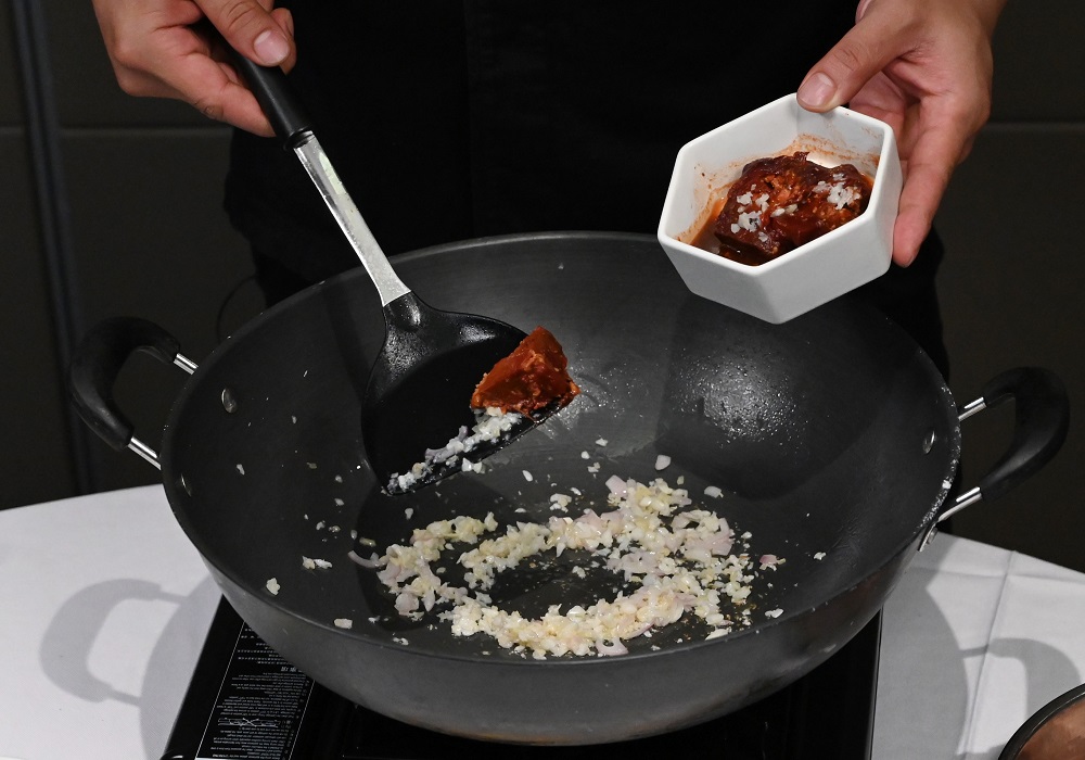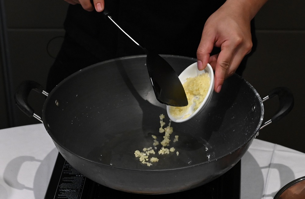 ▲4. 起油鑊炒香姜米、干蔥蓉及蒜蓉。