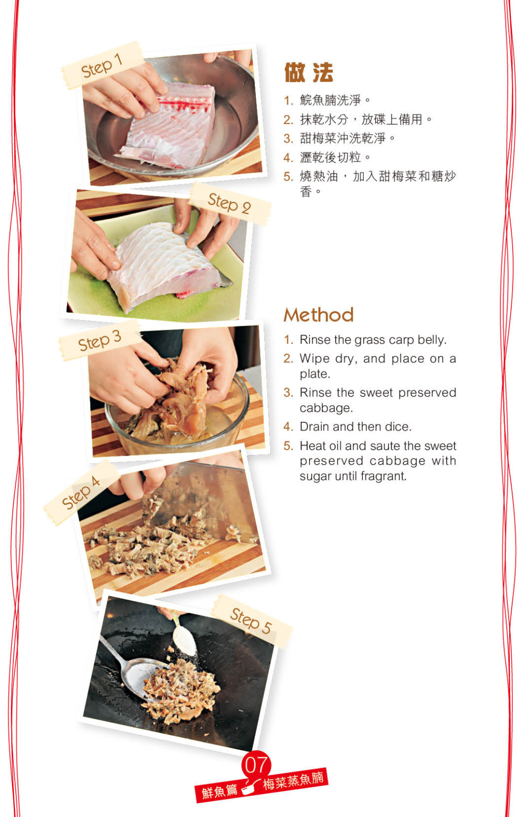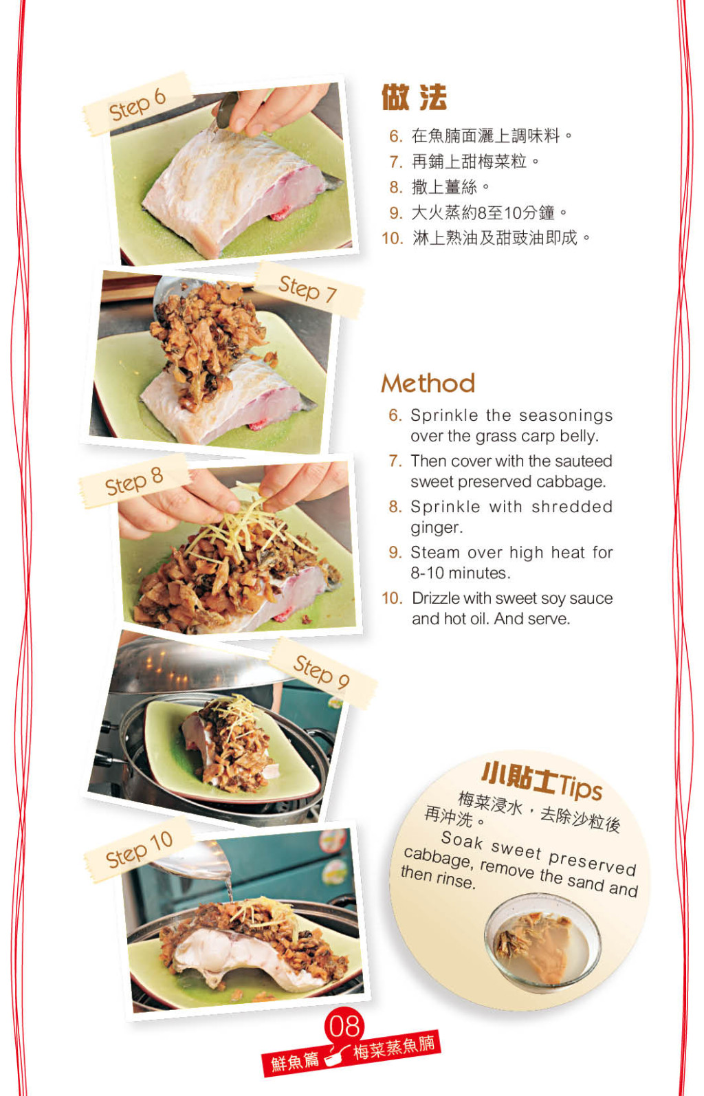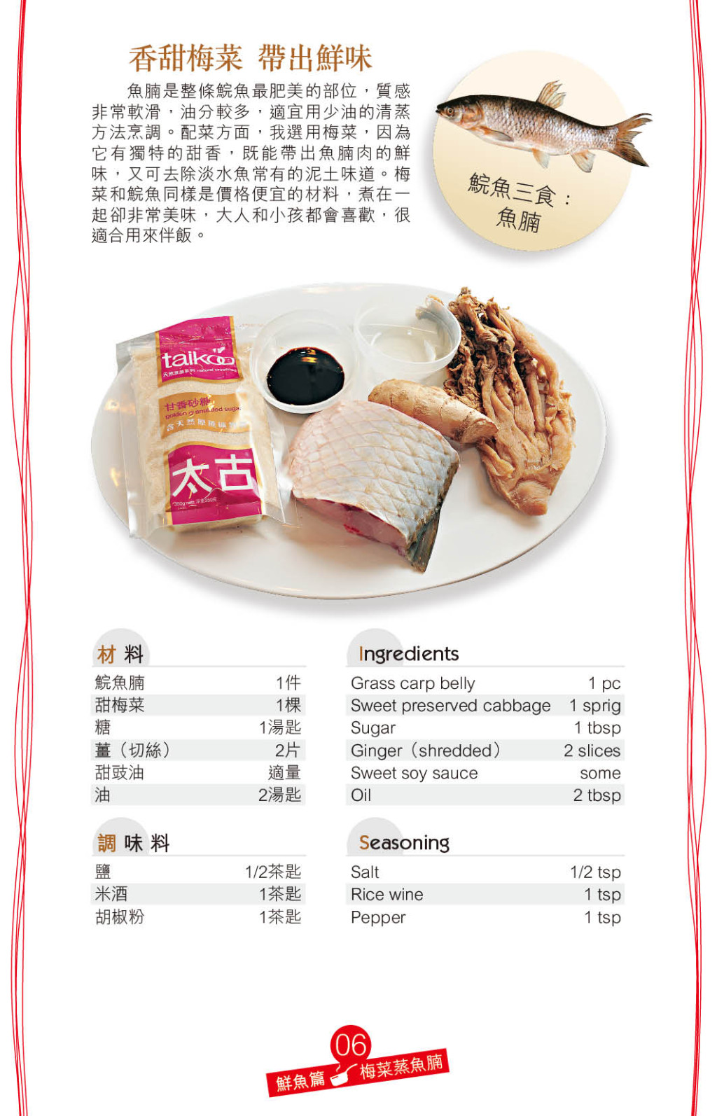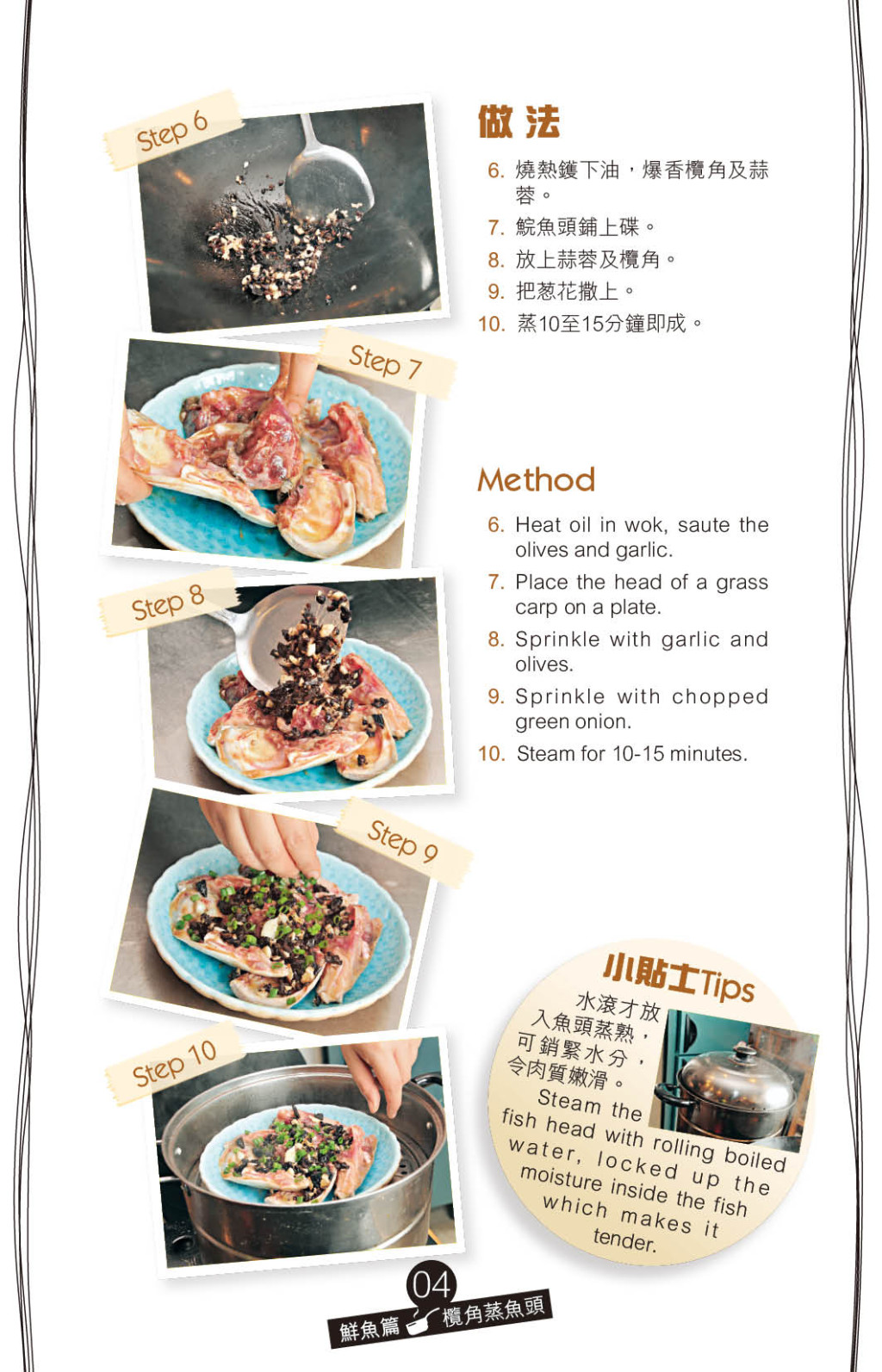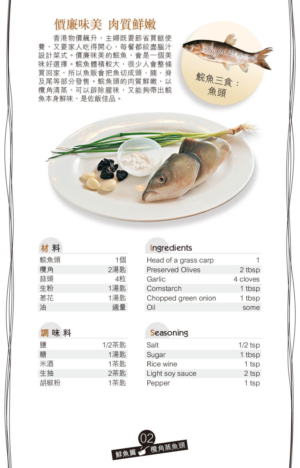 脆肉鯇是養(yǎng)殖魚,藉飼料提高魚肉的蛋白質(zhì)及礦物質(zhì),令肉質(zhì)更爽脆、結(jié)實。鯇魚屬淡水魚,泥味及腥味較重,必須徹底清潔才能做出美味菜式。今日除了教大家烹調(diào)“欖角蒸魚頭”、“梅菜蒸魚腩”、“涼瓜燜魚尾”三款鯇魚菜式,更會提供2式去魚頭腥味方法,非常實用。