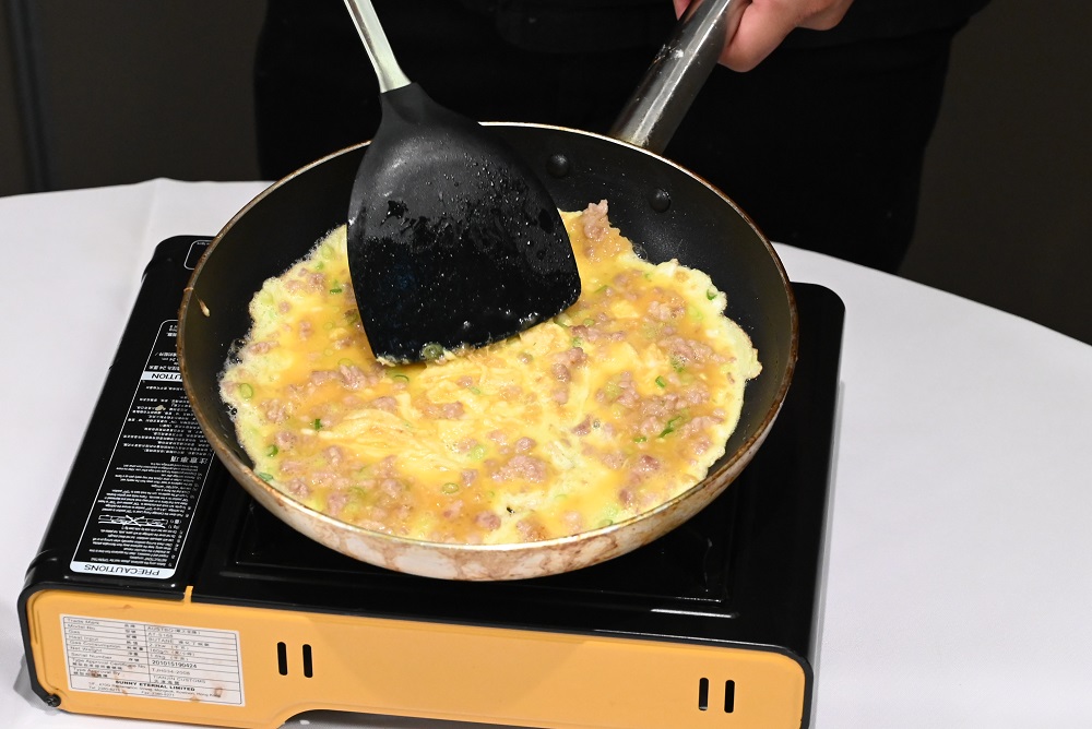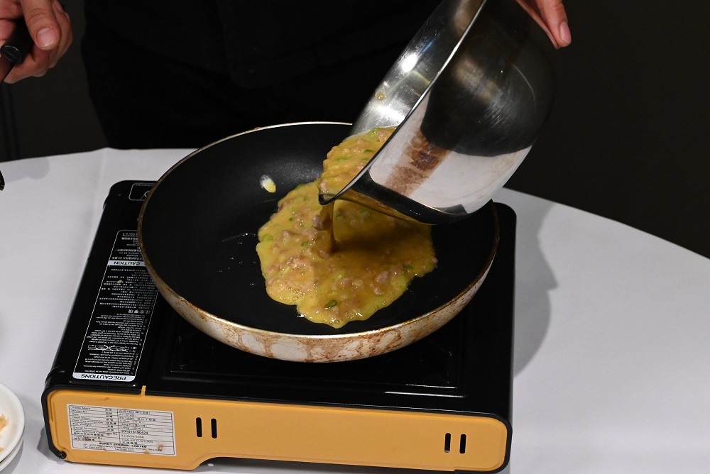 ▲7. 起油鑊,注入蛋液炒至半熟。