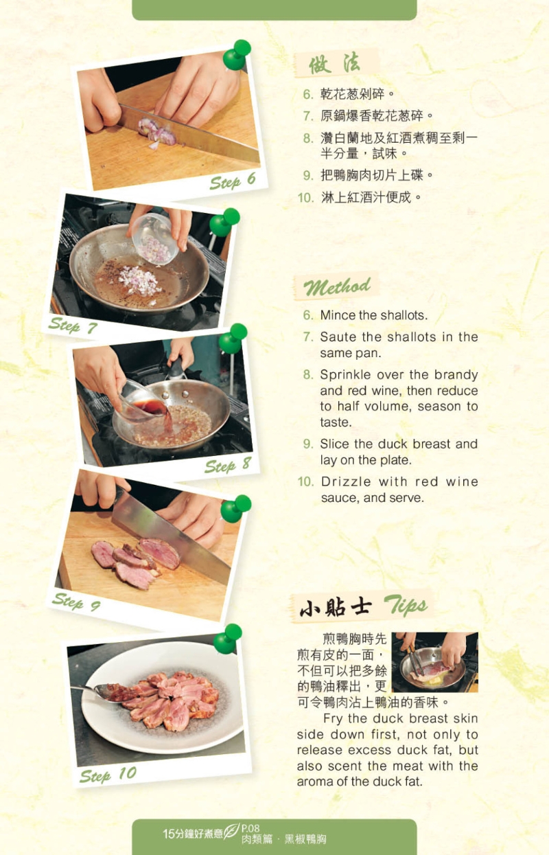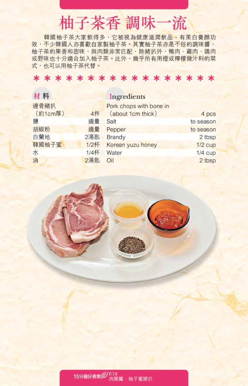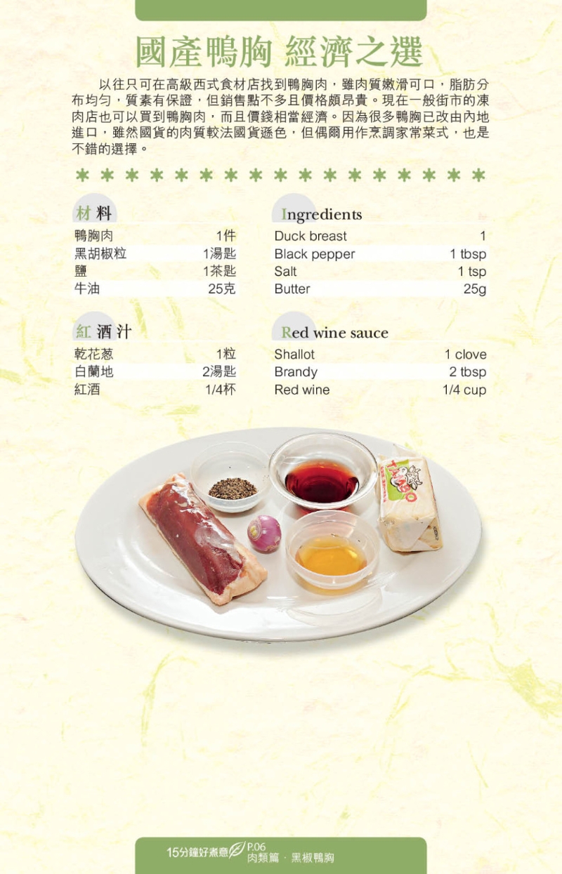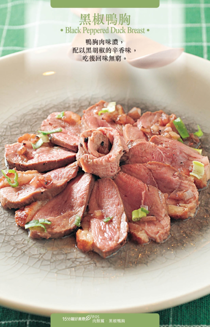 想速煮菜,應(yīng)選用易處理的食材,如今日推介的3個食譜:“黑椒鴨胸”、“香茅雞翼”、“柚子蜜豬扒”,便分別選用急凍鴨胸、雞翼及豬扒入饌,只須解凍后稍作調(diào)味即可烹調(diào)。調(diào)味料亦簡單,配搭黑椒、酒、香茅及柚子醬,做好的菜式即香氣四溢。想營養(yǎng)均勻及豐富一點,可加入甘筍、洋蔥、小椰菜等作配菜。