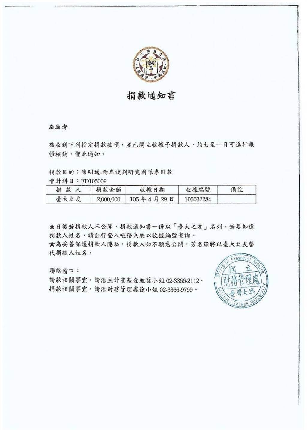 ▲王鴻薇指出,2016年3月23日,新竹物流前營(yíng)運(yùn)長(zhǎng)陳榮泉以新竹物流公司名義,匿名的方式捐給陳明通臺(tái)大研究案200萬,這筆錢捐的很急。王鴻薇辦公室提供