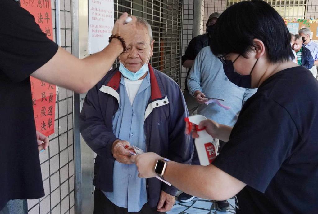 ▲九合一大選投票26日登場,新竹市第62投票所選務(wù)人員為排隊等候投票民眾量額溫,確保投票放疫無漏洞。中時網(wǎng)