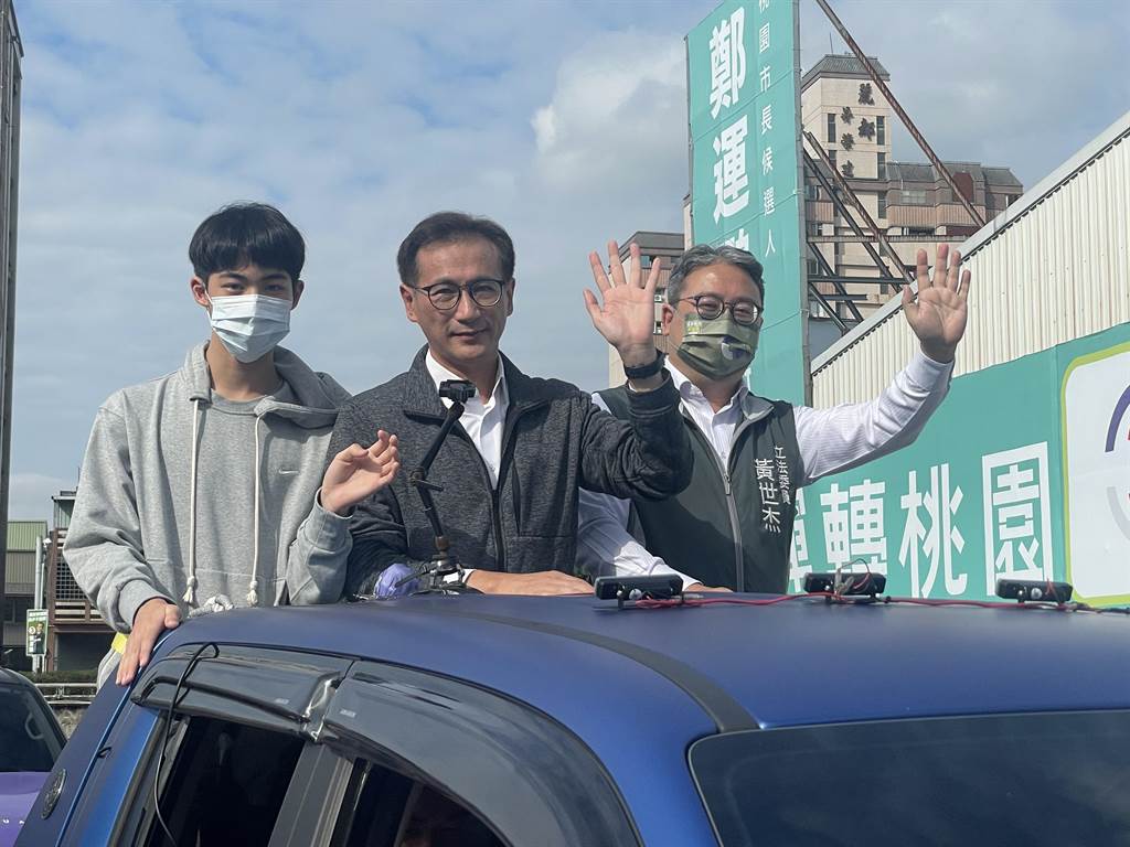 ▲民進(jìn)黨鄭運(yùn)鵬在兒子及立委黃世杰陪同下展開車隊(duì)掃街謝票。