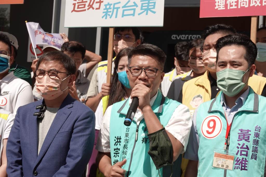 ▲民進(jìn)黨籍臺(tái)東市長(zhǎng)候選人洪宗楷(中)與連任的縣議員黃治維(右),洪宗楷在市區(qū)得票率比同黨縣長(zhǎng)候選人劉棹豪(左)更高。
