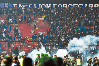 印尼東爪哇省瑪瑯縣坎朱魯漢體育場10月1日的足球比賽釀慘劇,當?shù)芈?lián)賽的主場球隊阿雷瑪在比賽中以2:3輸球,難以接受的球迷隨即涌入球場瘋狂滋事,警方發(fā)射催淚瓦斯鎮(zhèn)壓,恐慌中逃跑的人群在幾個出口處沖撞踩踏,造成135人死亡583人受傷。