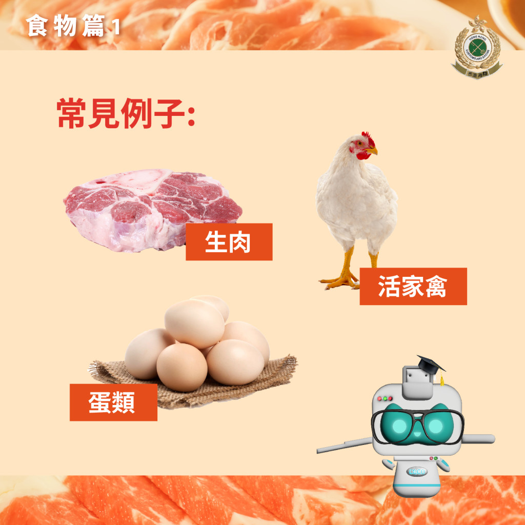 另外,根據(jù)香港法例第 132AK 章《進(jìn)口野味、肉類、家禽及蛋類規(guī)例》,旅客攜帶野味、肉類、家禽或蛋類入境而沒有原產(chǎn)地發(fā)證機(jī)關(guān)簽發(fā)的衛(wèi)生證明書及 / 或沒有食物環(huán)境衛(wèi)生署的事先書面批準(zhǔn),均屬違法,最高罰款港幣 50000 元及監(jiān)禁 6 個(gè)月。