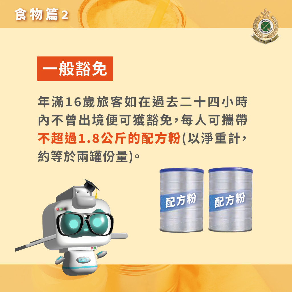 海關(guān)指根據(jù)香港法例第 60 章《進(jìn)出口條例》 ,旅客攜帶供 36 個(gè)月以下嬰幼兒食用的配方粉 (包括奶粉或豆奶粉) 出境,如沒有獲發(fā)出口許可證或獲得豁免,均屬違法,最高罰款港幣 500000 元及監(jiān)禁 2 年。年滿 16 歲旅客如在過去二十四小時(shí)內(nèi)不曾出境便可獲豁免,每人可攜帶不超過 1.8 公斤的配方粉 (以凈重計(jì),約等于兩罐份量)。
