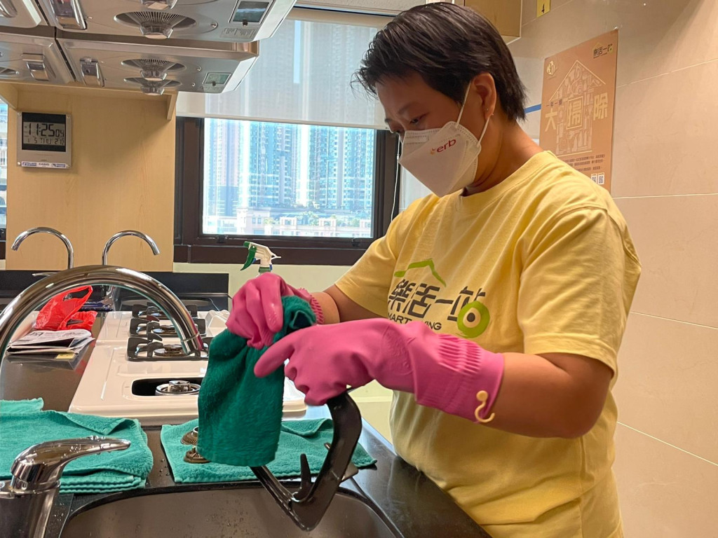 阿珠表示,清潔過程最緊要做到“眼到、手到、心到”,即是入屋后先找出污糟的地方;嘗試運(yùn)用不同的清潔工具和用品;以及需要和雇主有良好溝通,講清楚工作的重點(diǎn)。她指出,柜桶底最容易被忽略,她會(huì)特別提醒雇主是否需要抹。