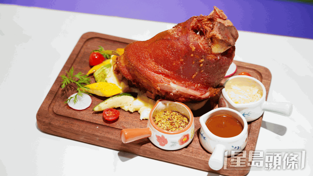 第一次定型、第二次上色、第三次炸脆表層。咸香酥脆的德國豬手經(jīng)過復(fù)雜程序制作后,才能保持到皮脆肉嫩,豬手亦不會(huì)因?yàn)槭ト庵兊酶缮?。上菜時(shí)會(huì)附上果醋燒汁、芥茉籽醬、酸菜三種醬料,酸甜開胃,緩解油膩。