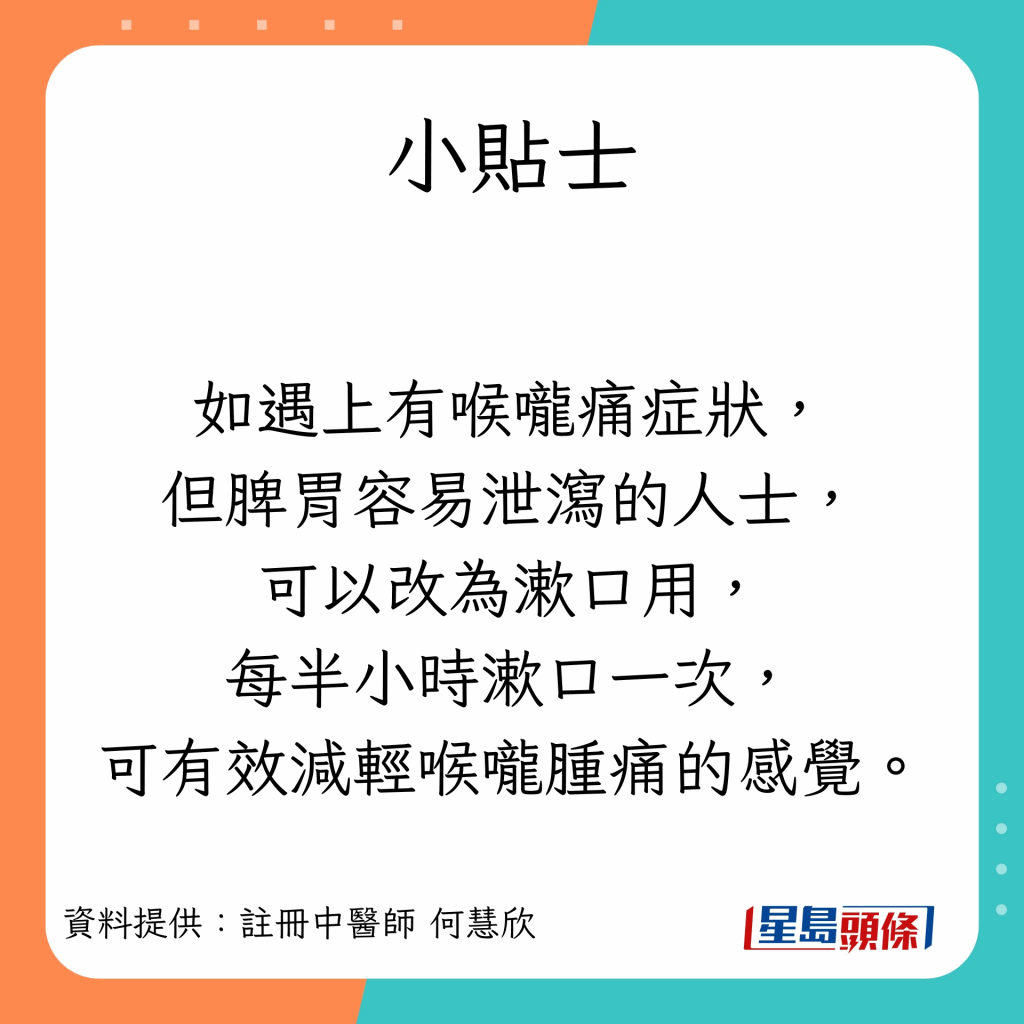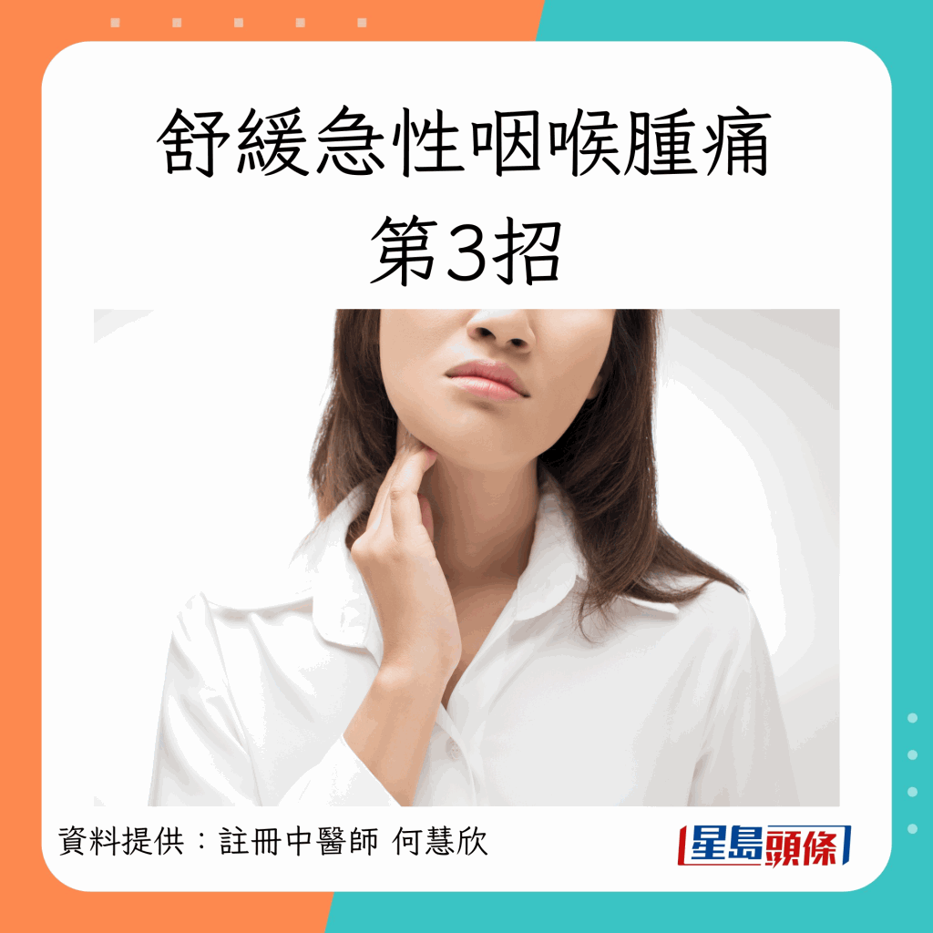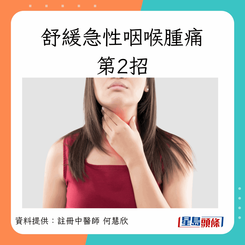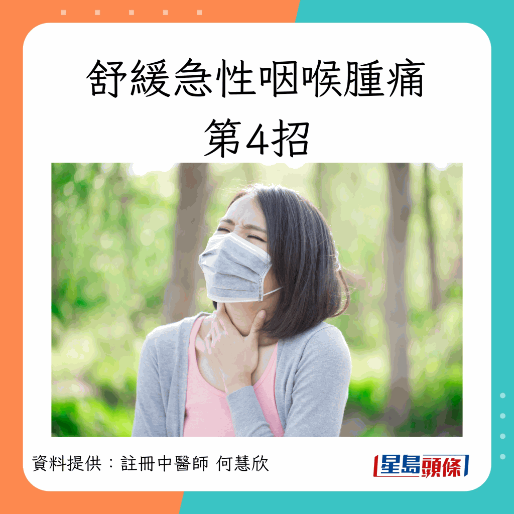 注冊中醫(yī)師何慧欣在其facebook專頁發(fā)文指,感染新冠肺炎或外感不適,或會突然咽喉不適、喉嚨干燥腫痛,嚴(yán)重者咽喉部出現(xiàn)紅腫及局部水腫的情況。她建議用以下4種方法有助紓緩急性咽喉腫痛。