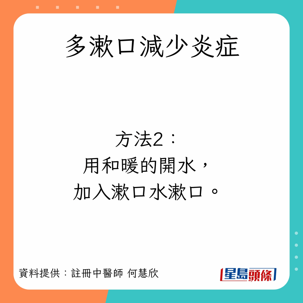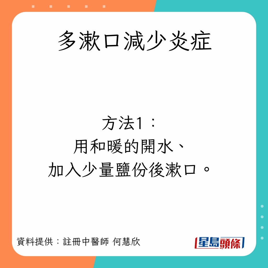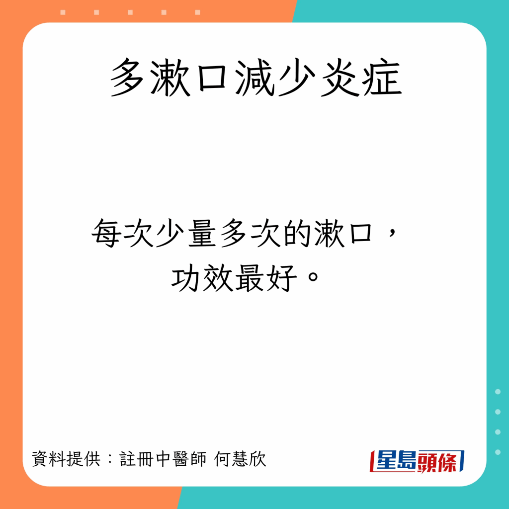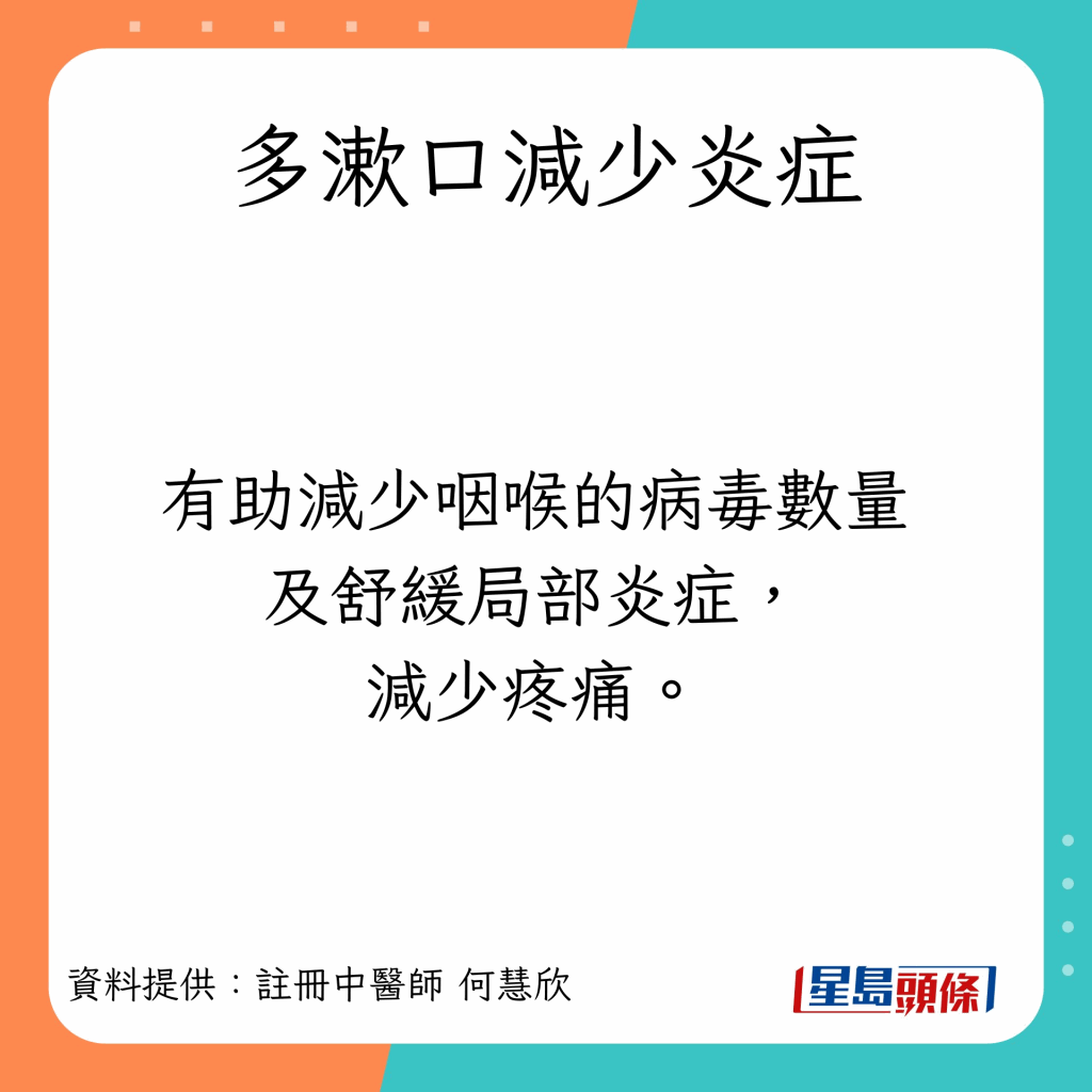 注冊中醫(yī)師何慧欣在其facebook專頁發(fā)文指,感染新冠肺炎或外感不適,或會突然咽喉不適、喉嚨干燥腫痛,嚴(yán)重者咽喉部出現(xiàn)紅腫及局部水腫的情況。她建議用以下4種方法有助紓緩急性咽喉腫痛。
