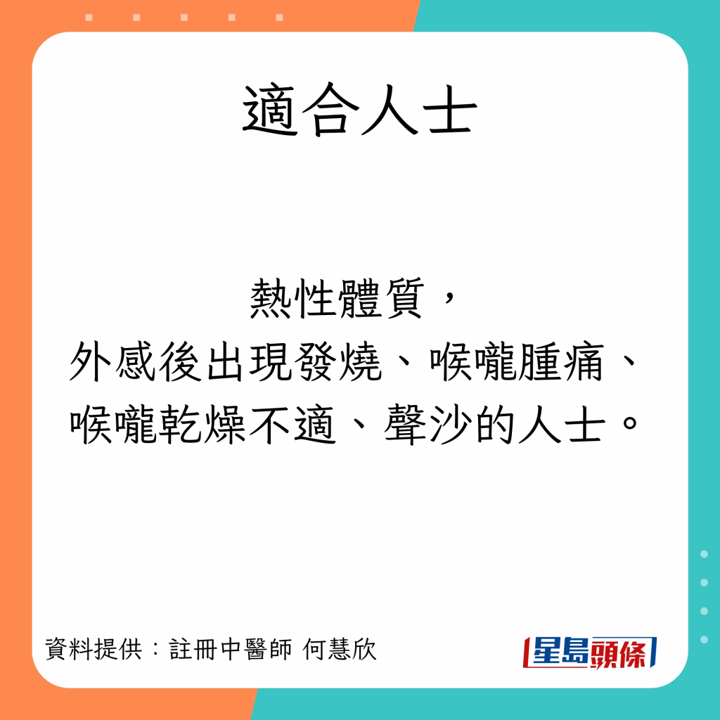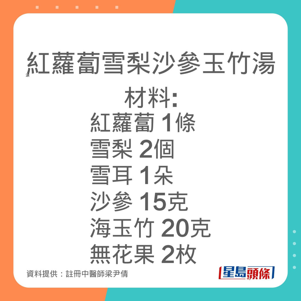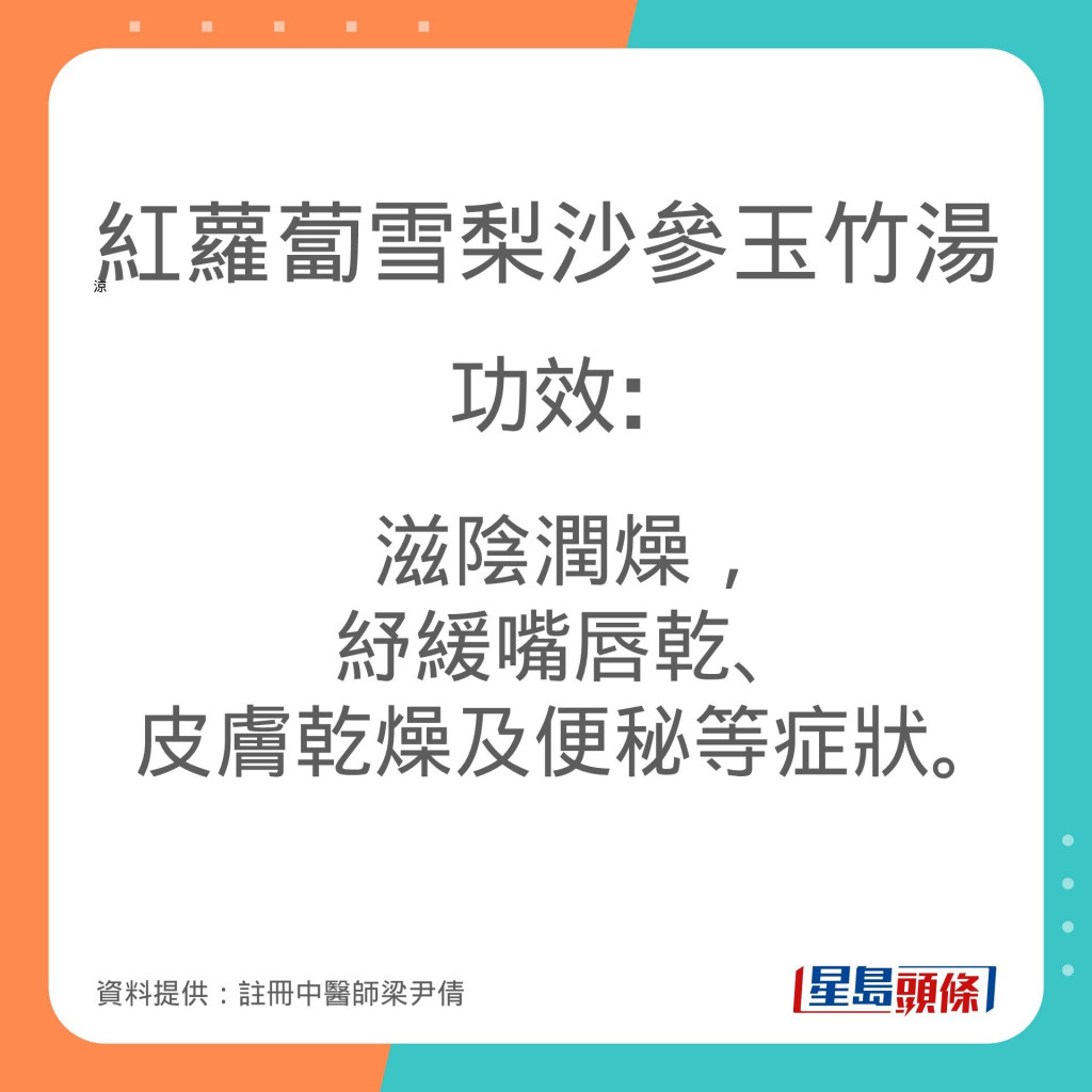 此外,梁醫(yī)師推介適合燥熱、流鼻血的人士飲用的滋潤湯水。