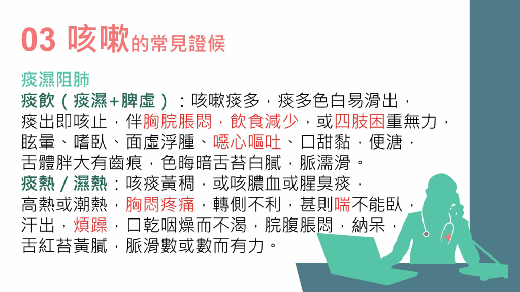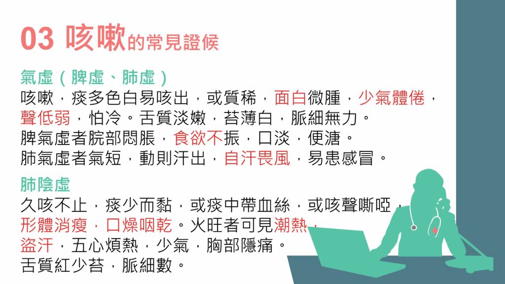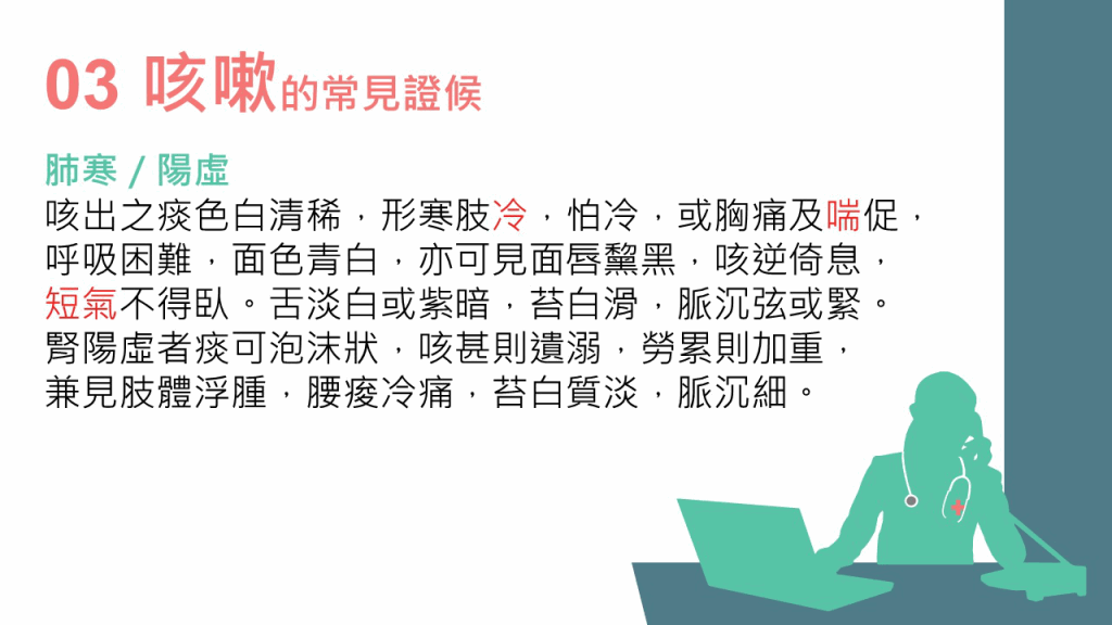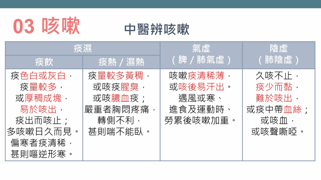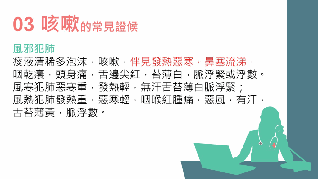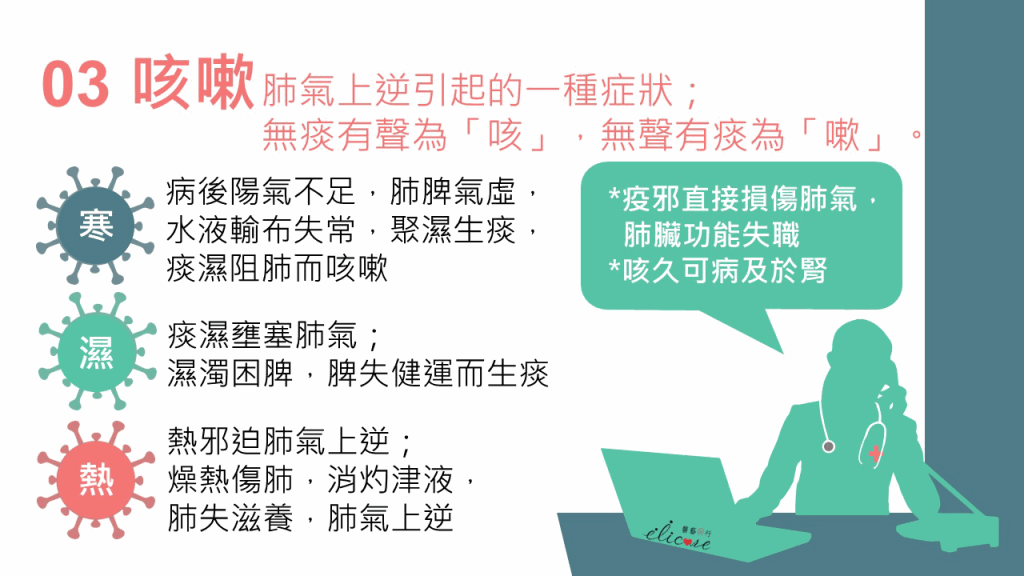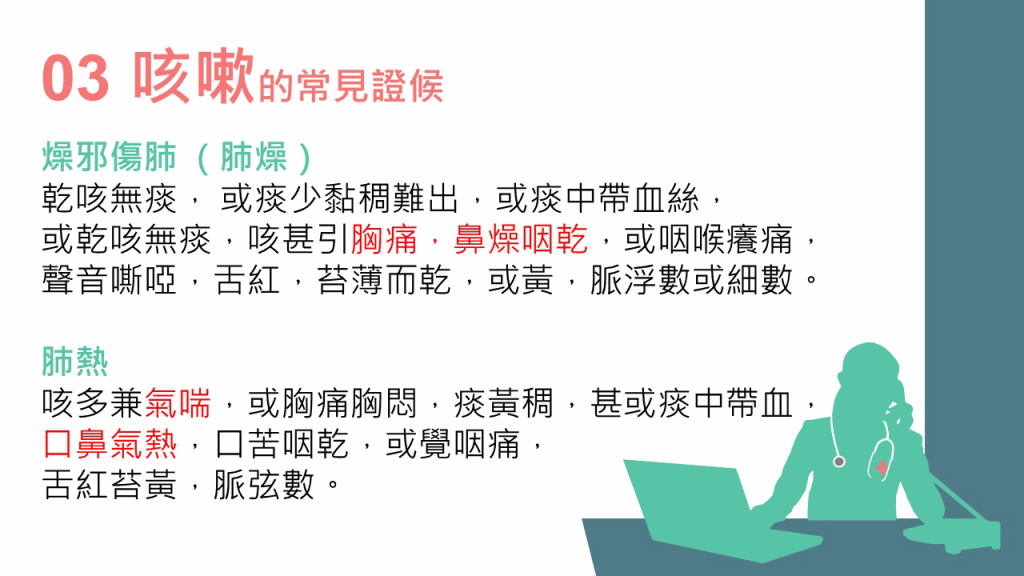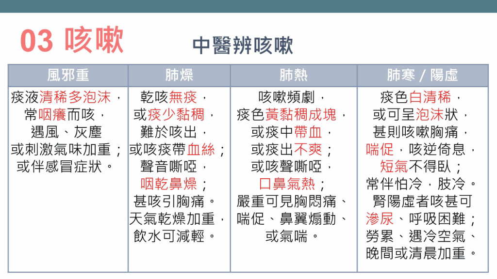林家揚醫(yī)師表示,咳嗽是肺氣上逆引起的癥狀。他解釋,無痰有聲為“咳”,無聲有痰為“嗽”,而咳嗽亦可按“寒”、“濕”、“熱”分為3種病因??人?種常見證候如下:
