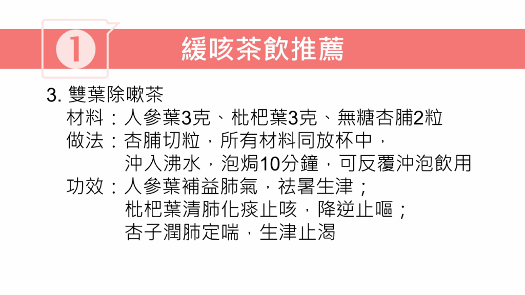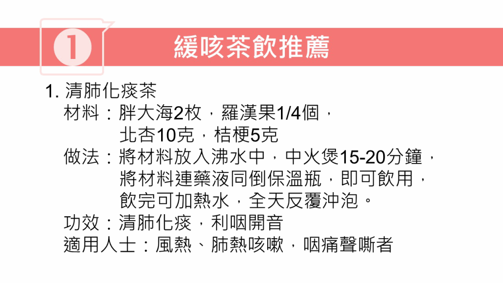 林家揚醫(yī)師又推介4款止咳茶,以及1套理肺按摩法,有助改善咳嗽癥狀: