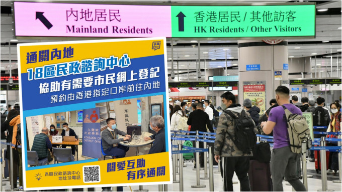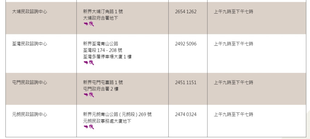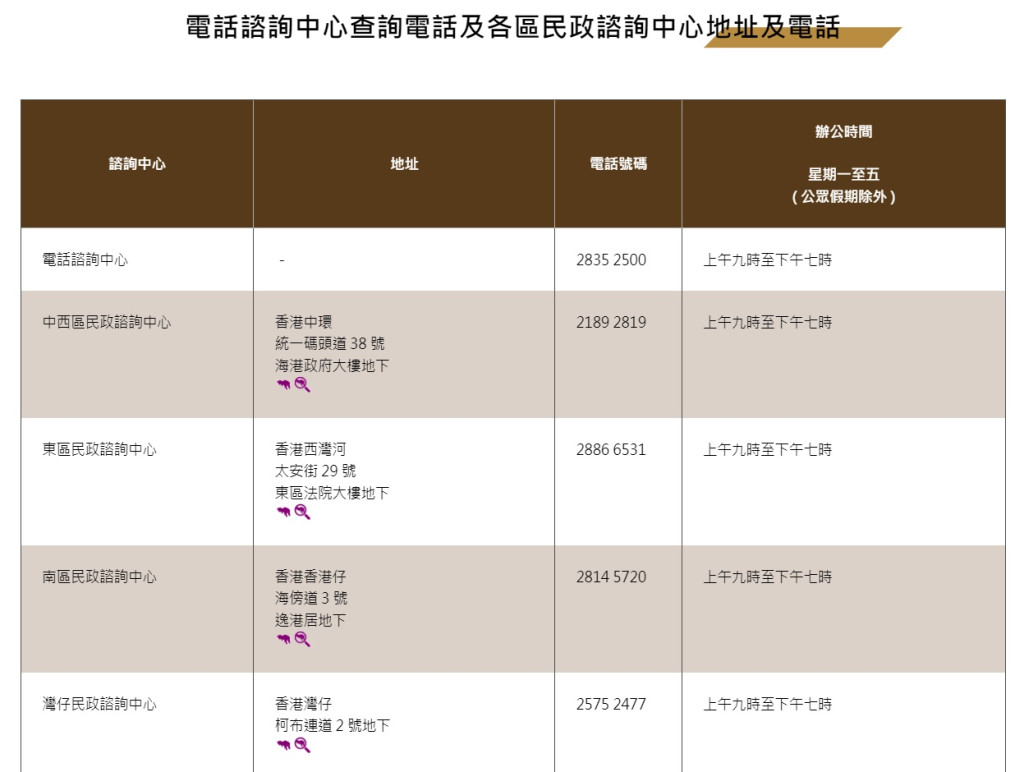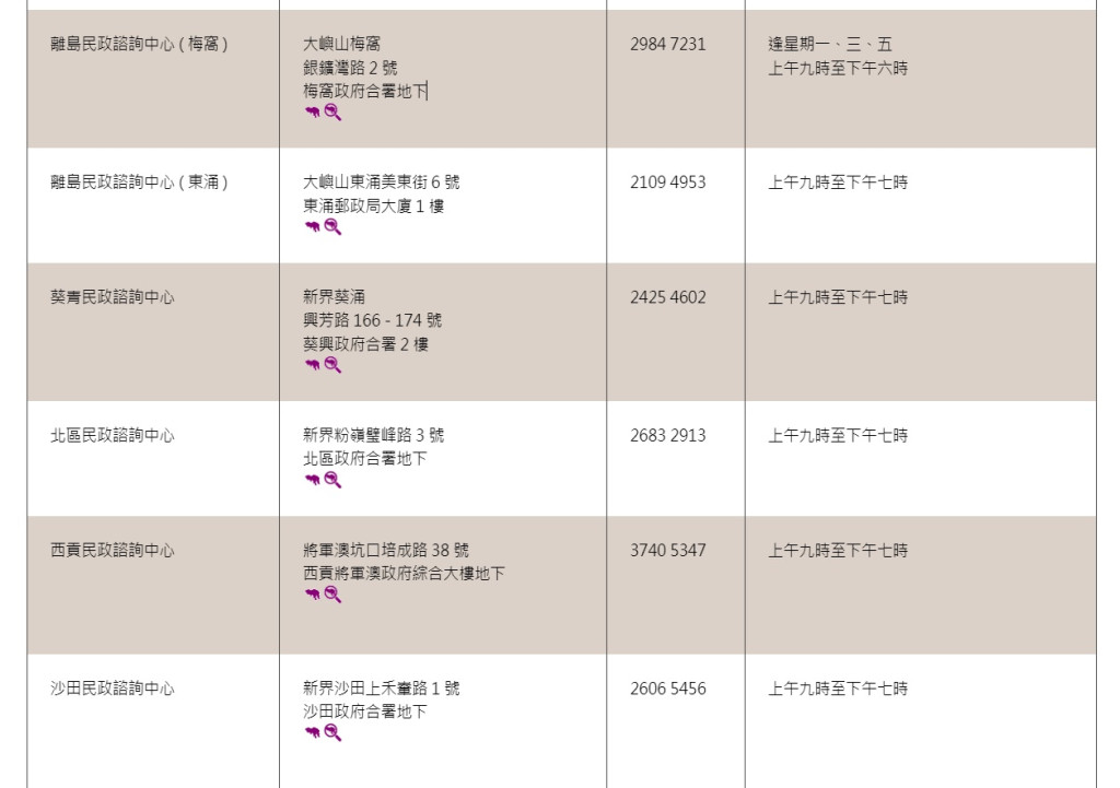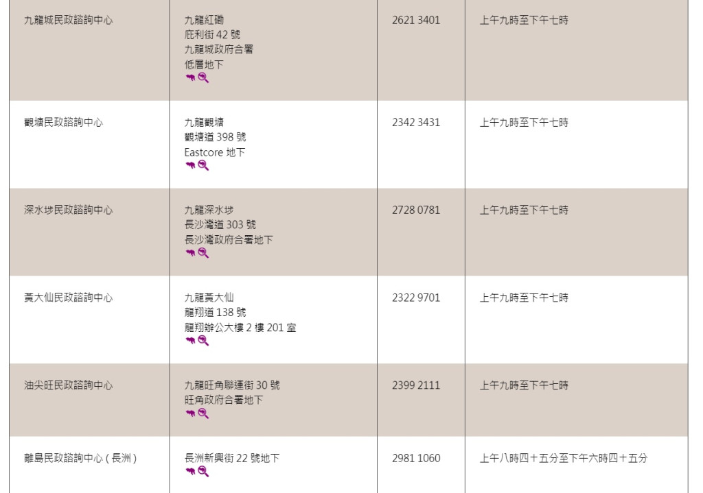 香港和內(nèi)地已于周日(8日)起通關(guān),往來香港與內(nèi)地的人士,須于網(wǎng)上預約由香港指定口岸前往內(nèi)地,18區(qū)民政事務(wù)處可協(xié)助市民登記。有需要的市民可在辦公時間內(nèi),到各區(qū)民政咨詢中心找職員協(xié)助。各區(qū)民政咨詢中心地址、電話和辦公時間如下: