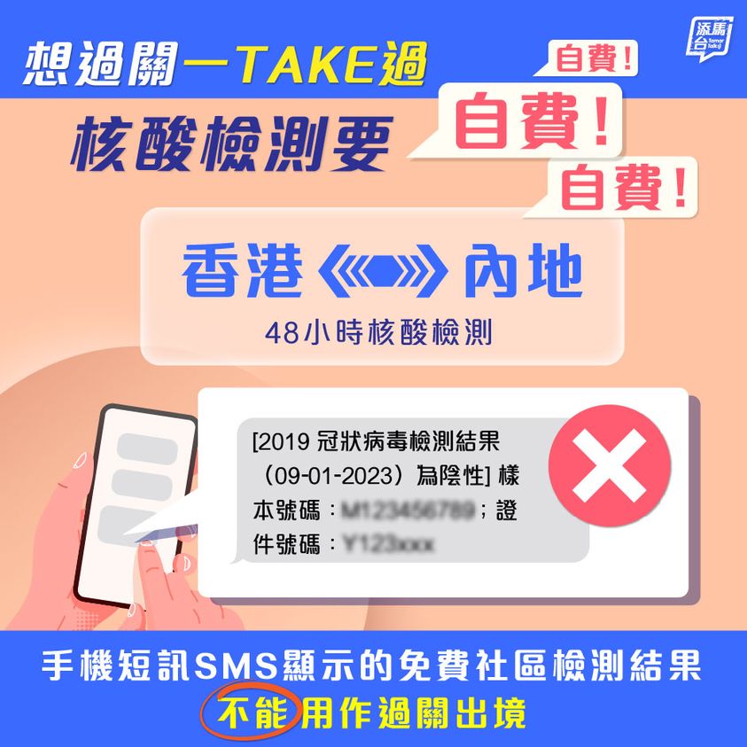 政府近日不斷再提醒市民,出發(fā)前48小時內(nèi)做的核酸檢測,除要陰性,還要自費。以手機短訊顯示的免費小區(qū)檢測結(jié)果,不能過關(guān)出境。