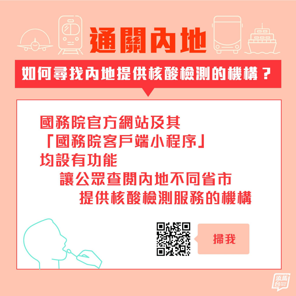 ●現(xiàn)時國務(wù)院官方網(wǎng)站及其“國務(wù)院客戶端小程序”中均設(shè)有功能,讓公眾查閱內(nèi)地不同省市提供核酸檢測服務(wù)的機構(gòu)。相關(guān)檢測結(jié)果均可作內(nèi)地及香港過關(guān)之用。下圖提供掃碼連結(jié):