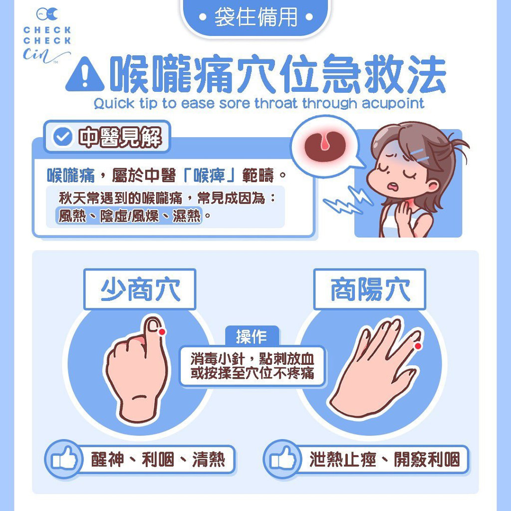 除了以鹽水、漱口水或蓮花清瘟膠囊里的藥粉開水(清熱藥材)嗽口,也可以透過穴位放血來減輕痛楚,梁醫(yī)師教大家按2個(gè)穴位。