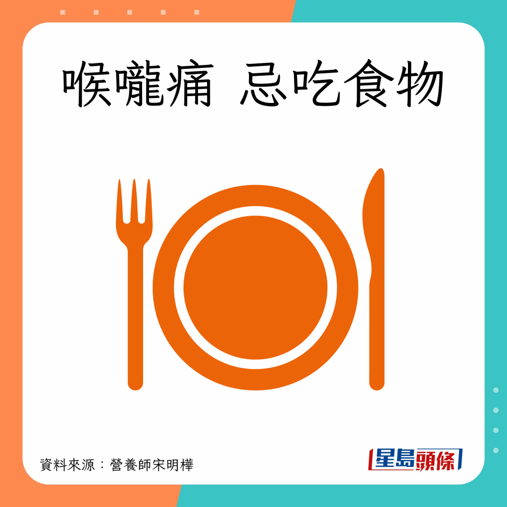 營養(yǎng)師宋明樺指,喉嚨痛時要避免3類食物,以免癥狀加劇,減慢復(fù)原時間。另她建議吃2類食物,以補充熱量,加快復(fù)原。