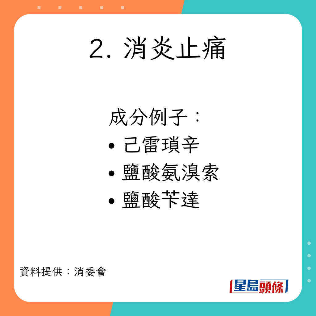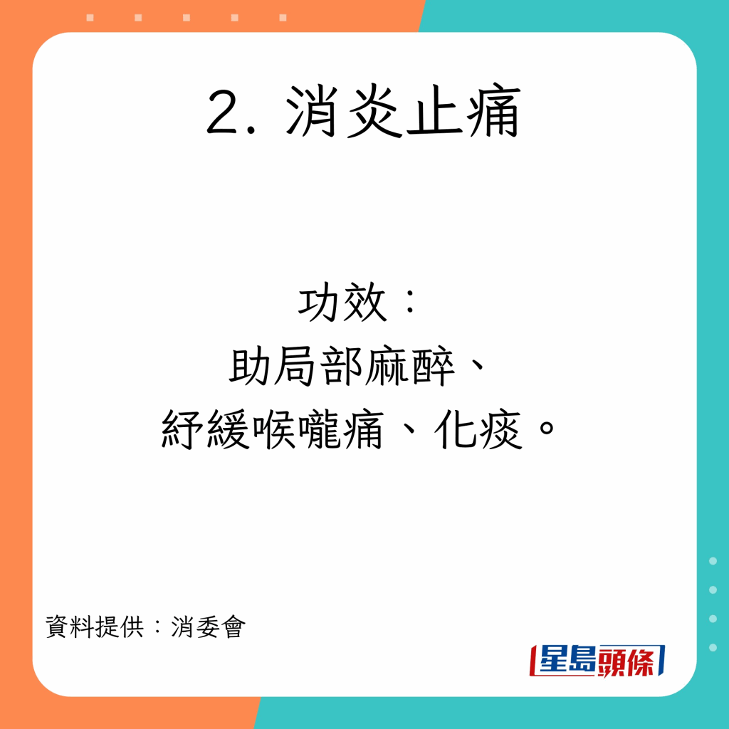 根據(jù)消委會(huì)檢測結(jié)果,含西藥成分的喉糖有10款,標(biāo)示了藥物注冊(cè)編號(hào)。綜合崔俊明藥劑師及黃德彰醫(yī)生的資料和意見,這些樣本中的主要有效成分可粗略分為以下3類: