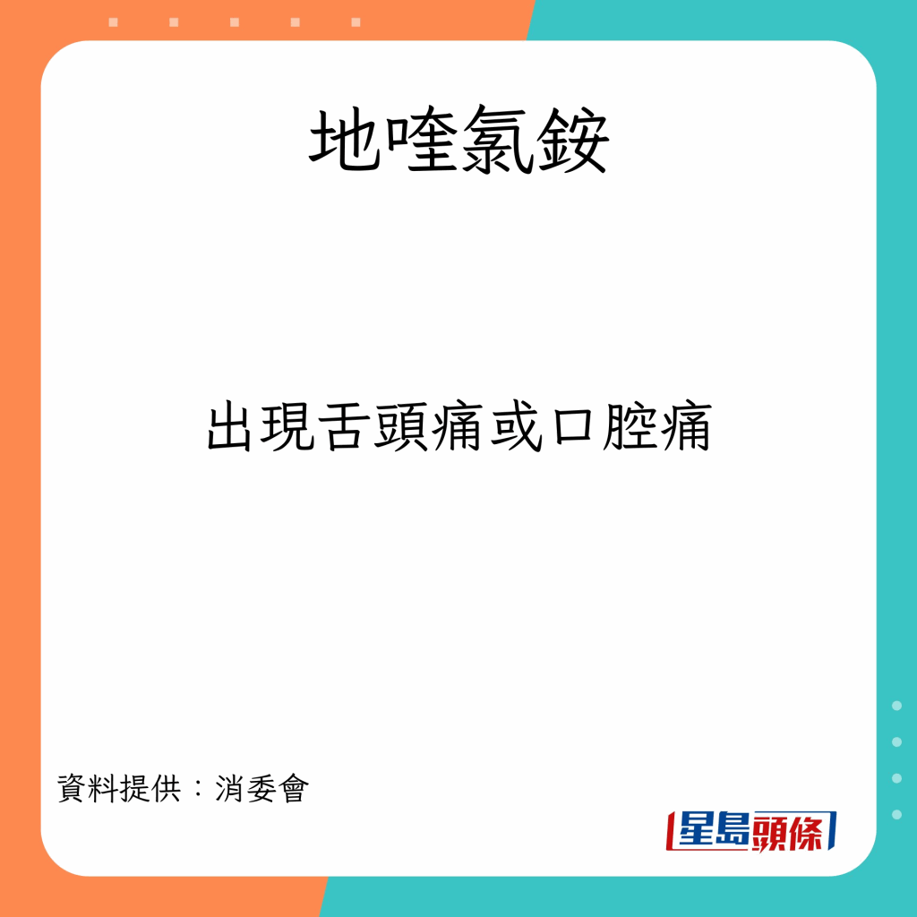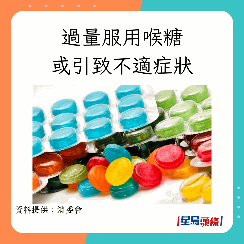 消委會(huì)建議大家必須留意喉糖的成分和服用分量,如過量服用或會(huì)令身體出現(xiàn)口腔痛、過敏或呼吸困難等征狀。過量服用相關(guān)成分的喉糖可引致以下不適癥狀: