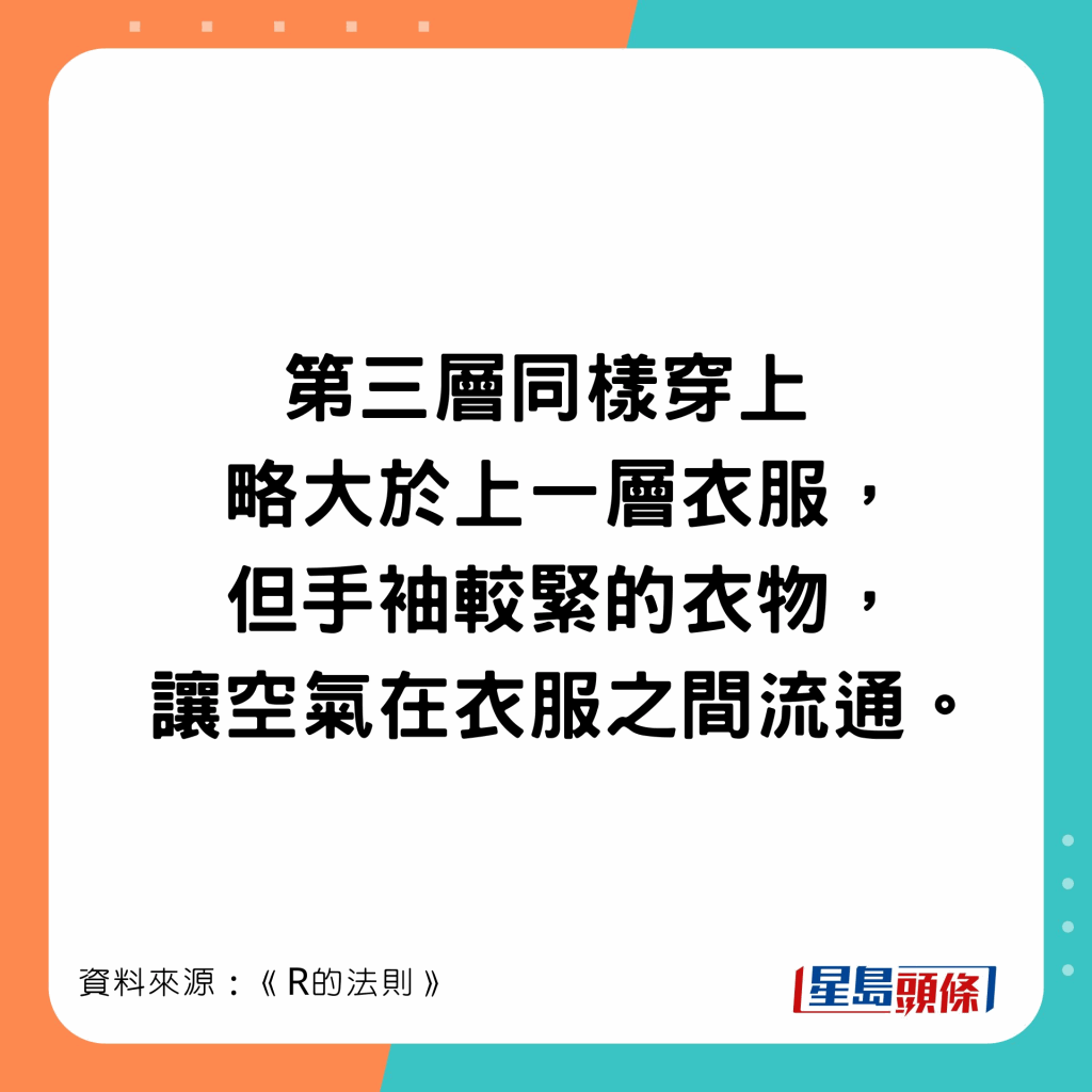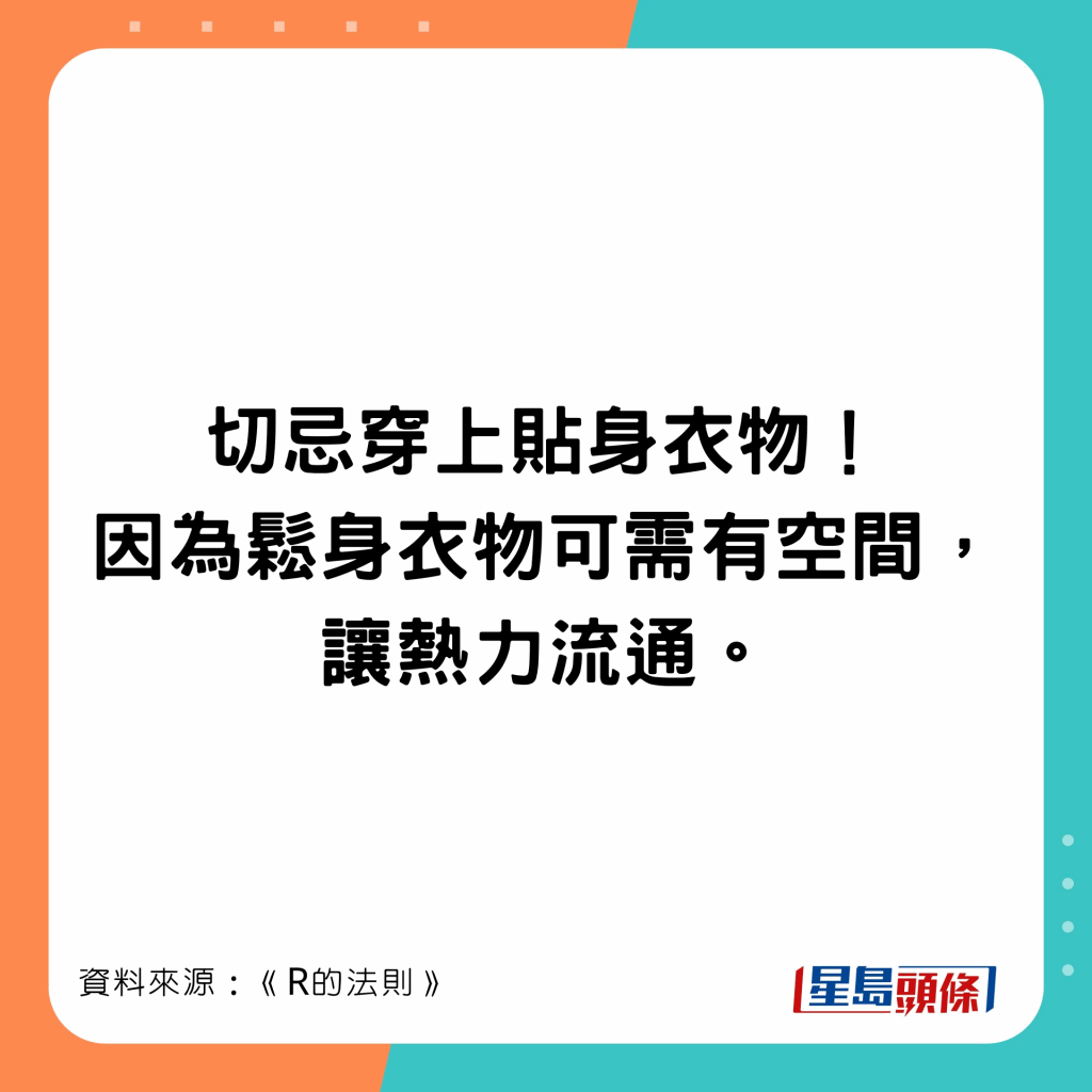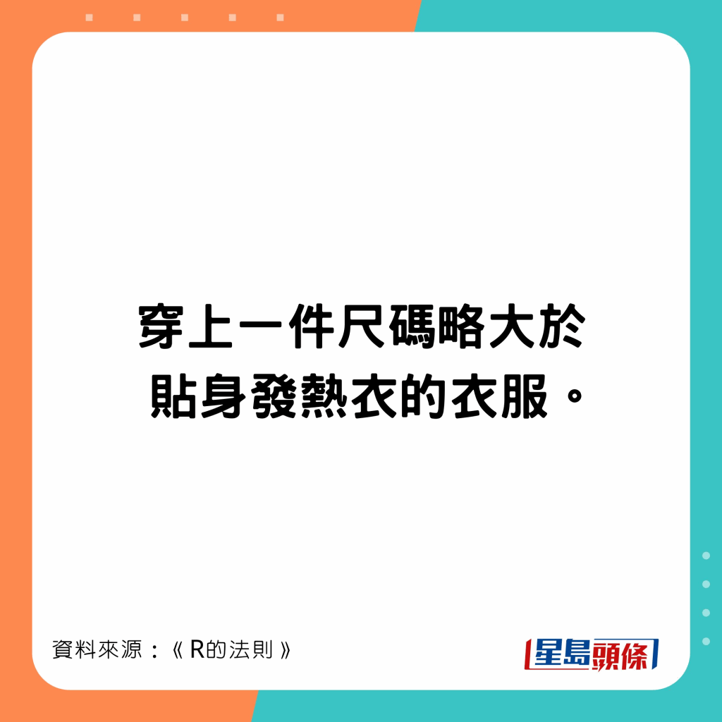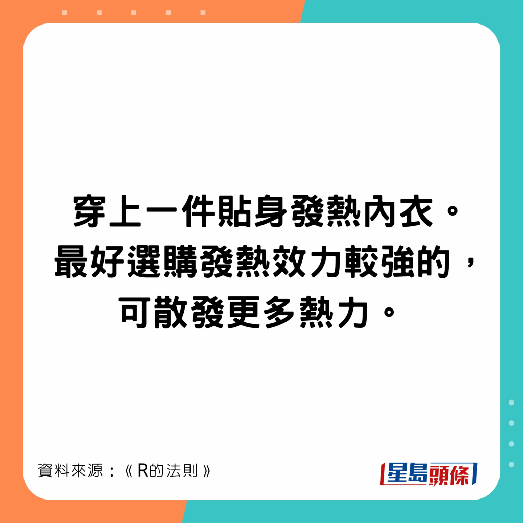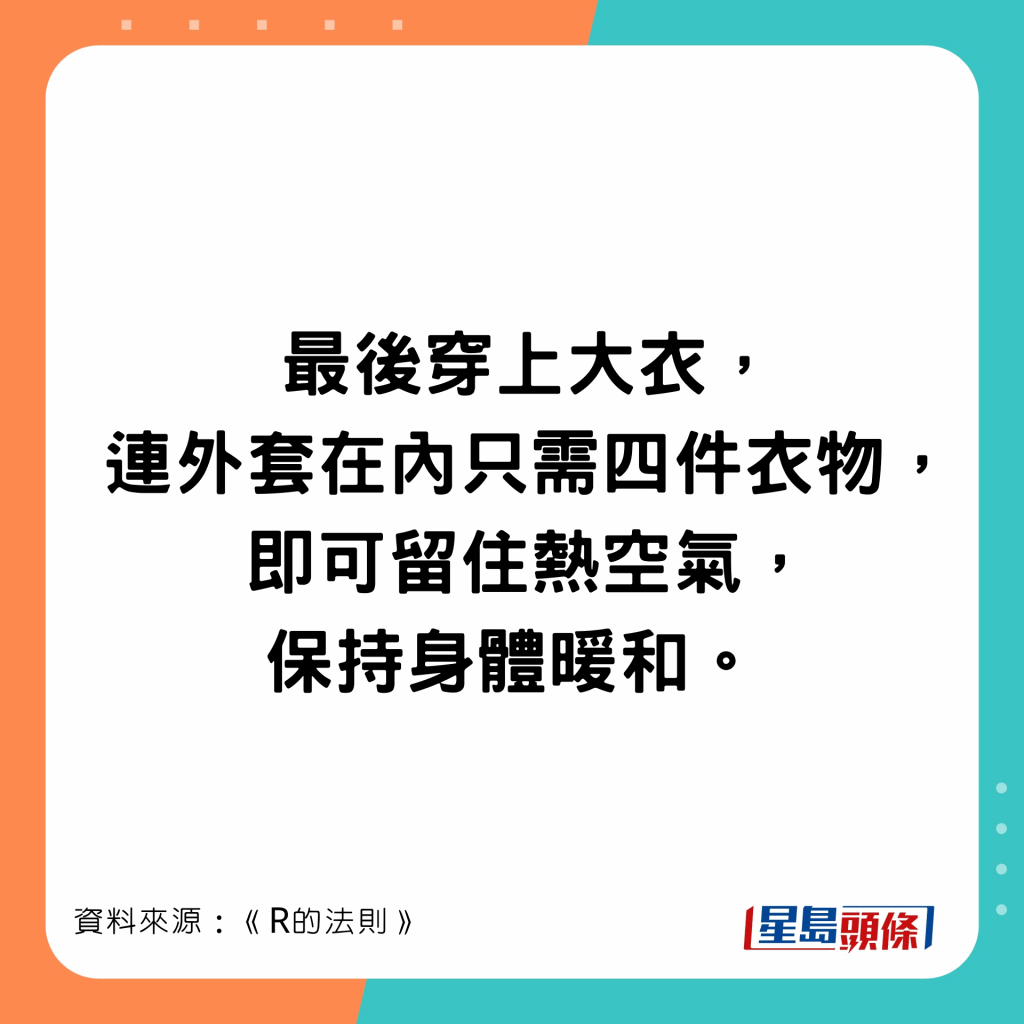 日本節(jié)目《R的法則》實測,穿4件比穿7件衣服暖,穿太多衣服則更冷。節(jié)目教最保暖最輕便穿衣方法,底層、中層和外層所穿的衣服也不同,第二層衣服出錯就很難暖身。