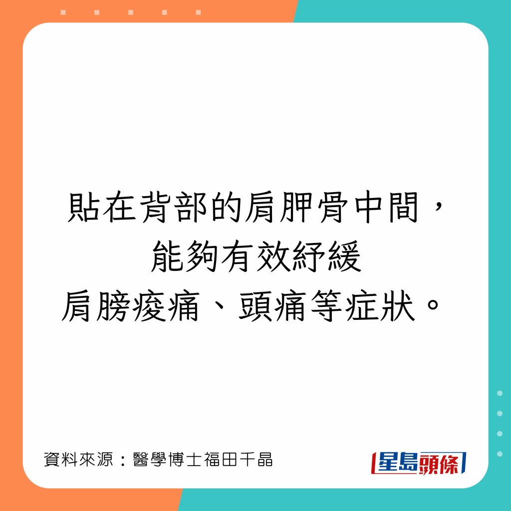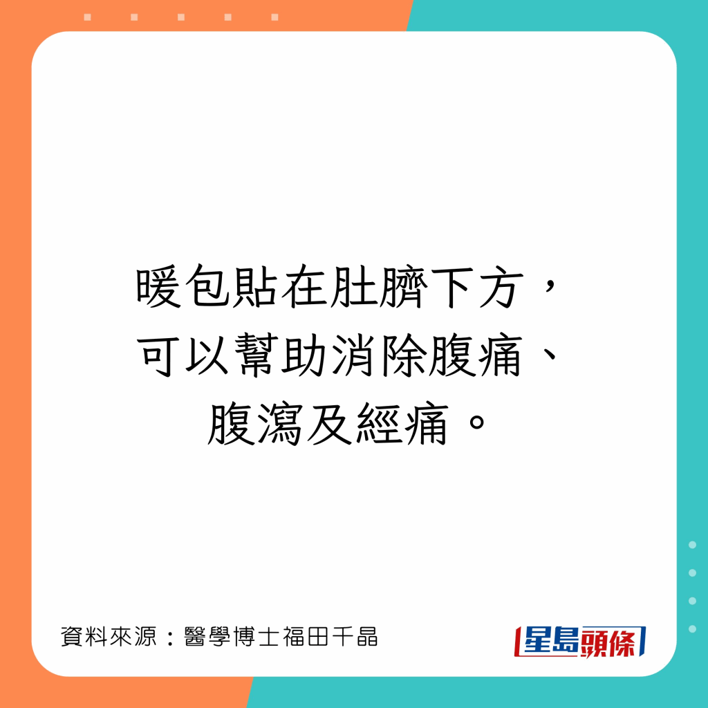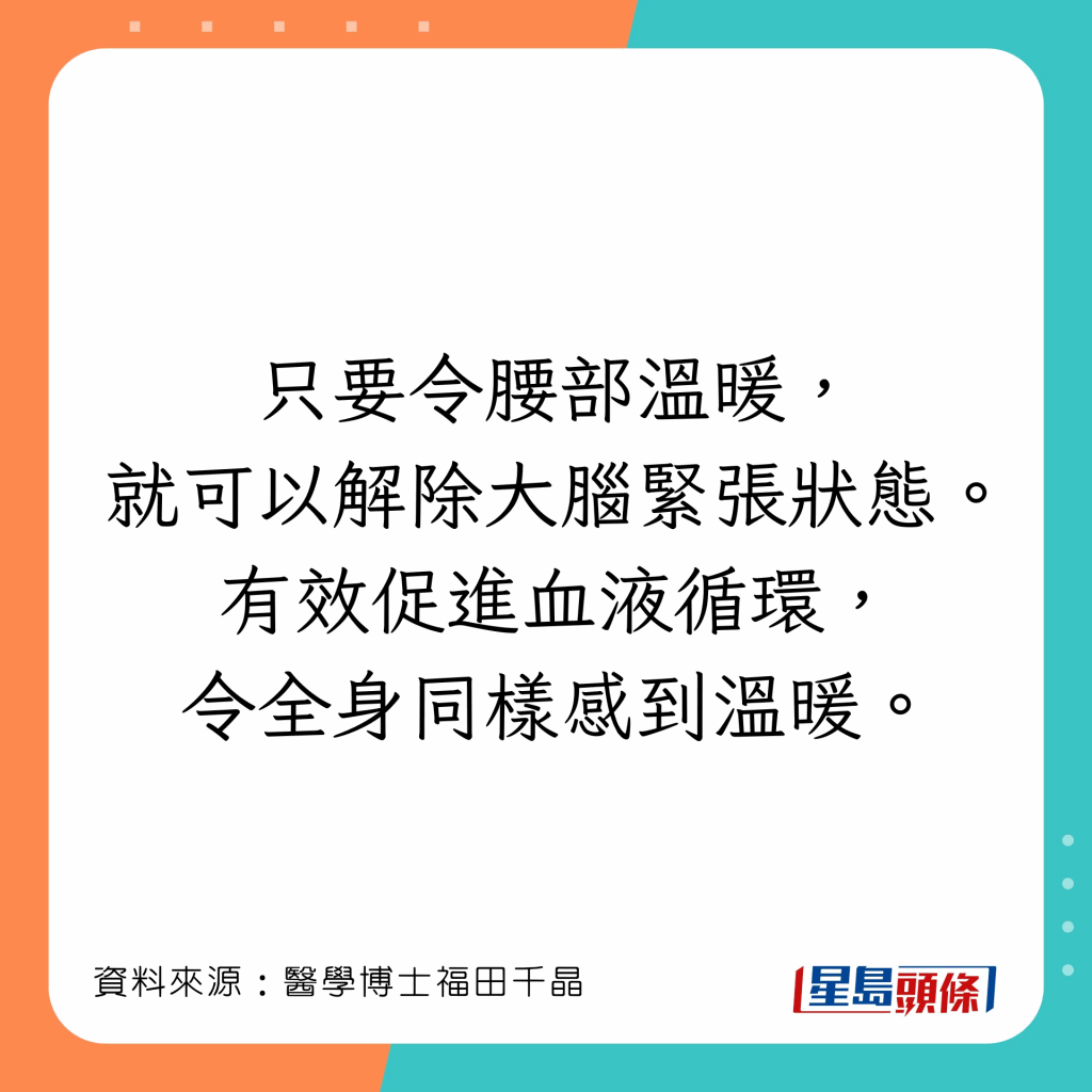 人體有許多可以令全身溫暖的穴位,福田千晶指,若感到寒冷,把暖包放在4個部位,會令全身溫暖: