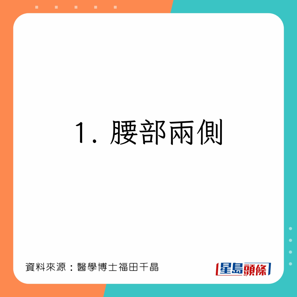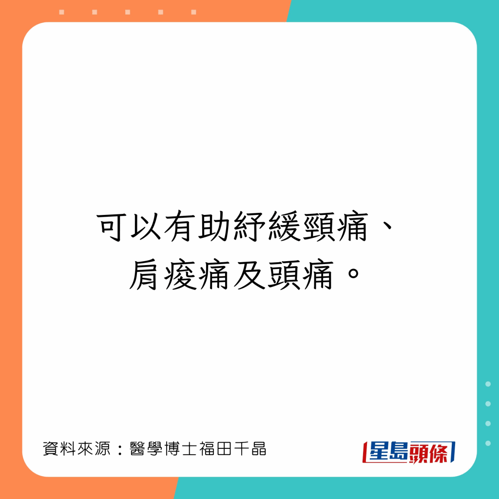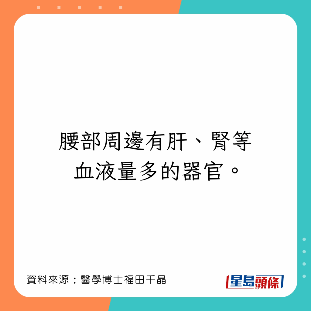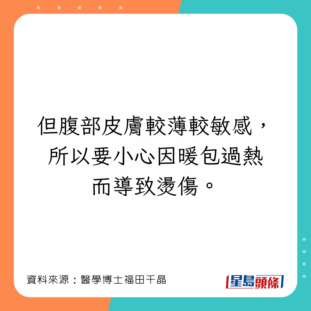 人體有許多可以令全身溫暖的穴位,福田千晶指,若感到寒冷,把暖包放在4個部位,會令全身溫暖: