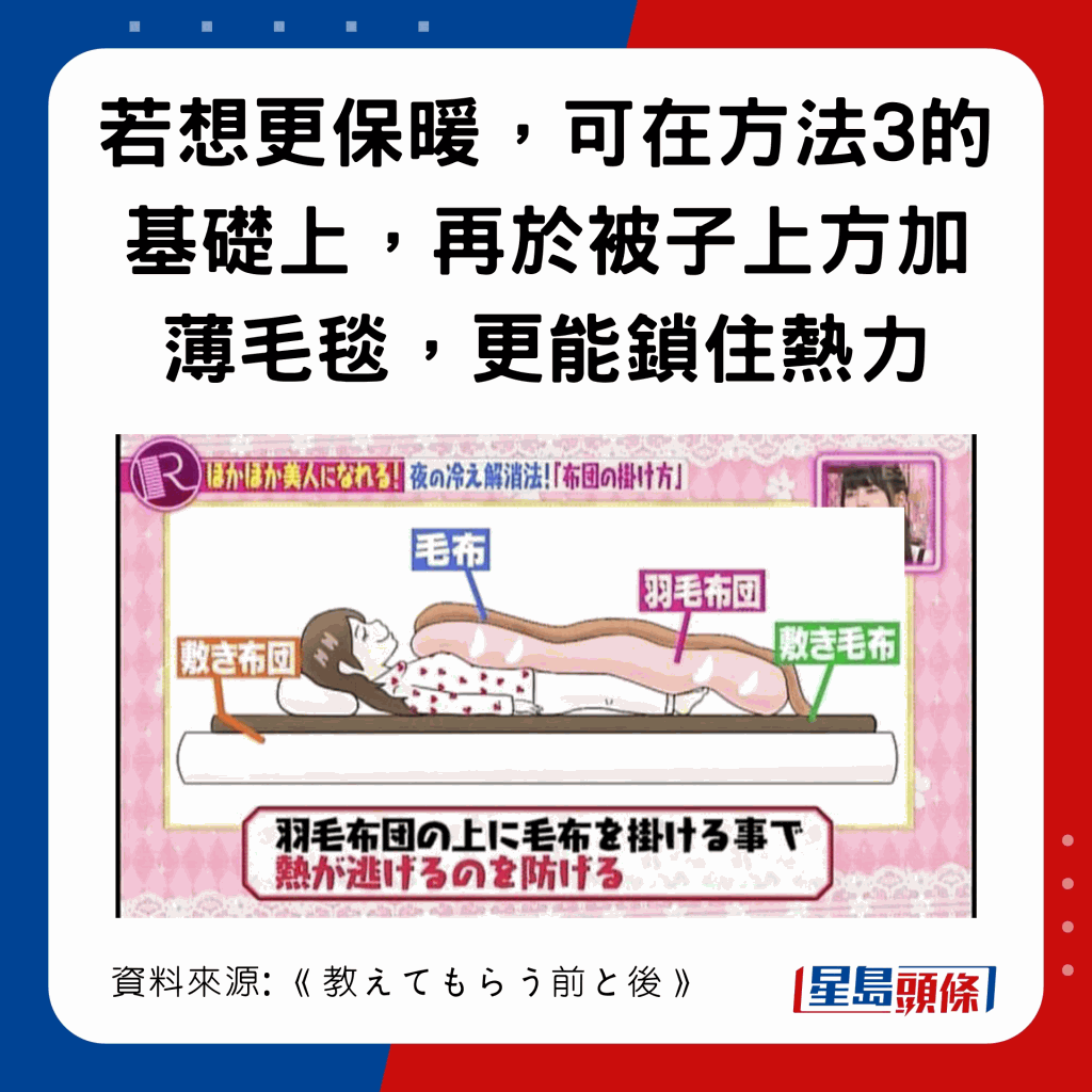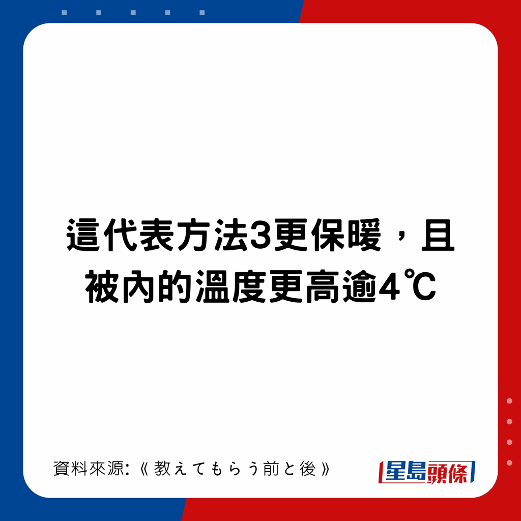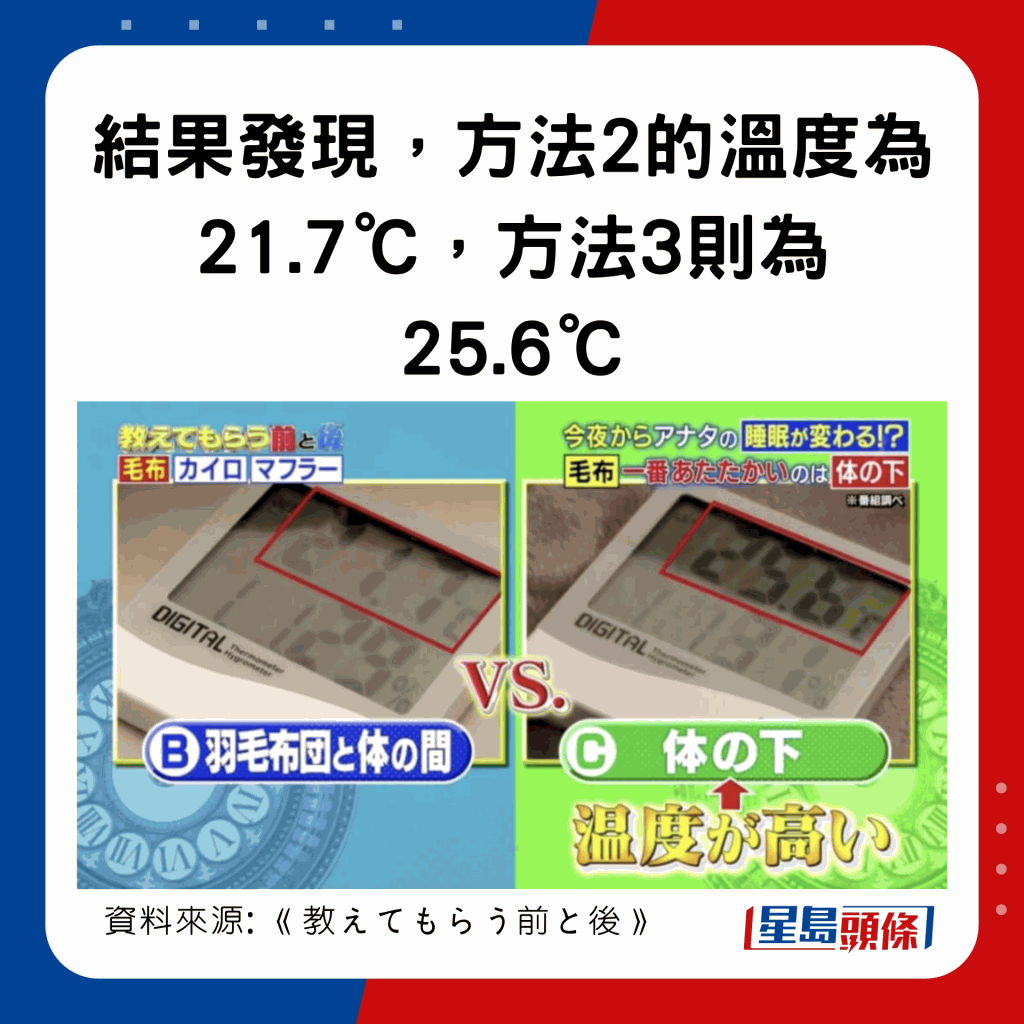 日本節(jié)目《教えてもらう前と後》曾比拼3種蓋被方法,有1個方法可暖4°C,達至25.6°C: