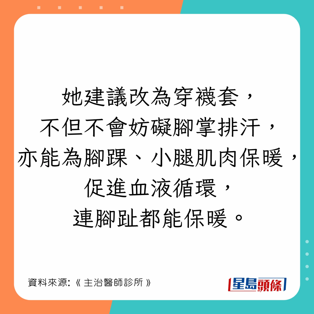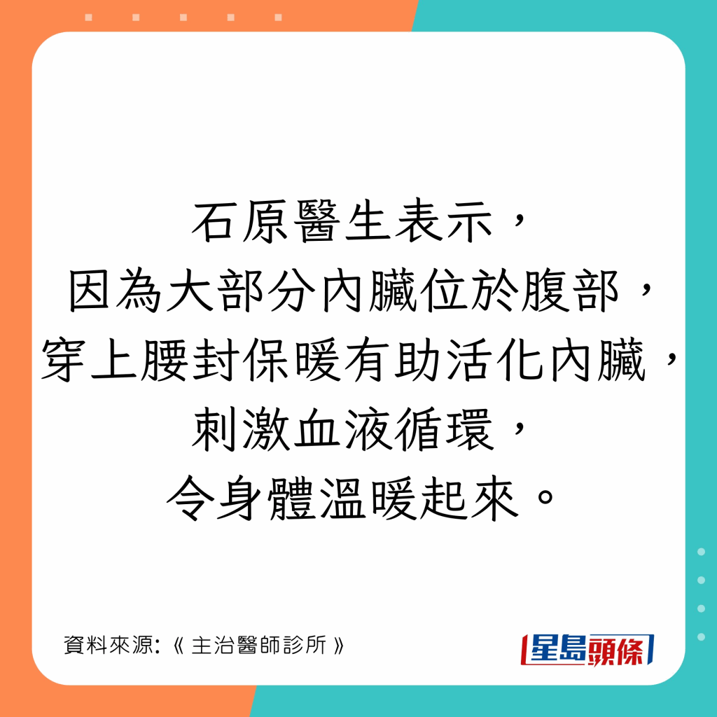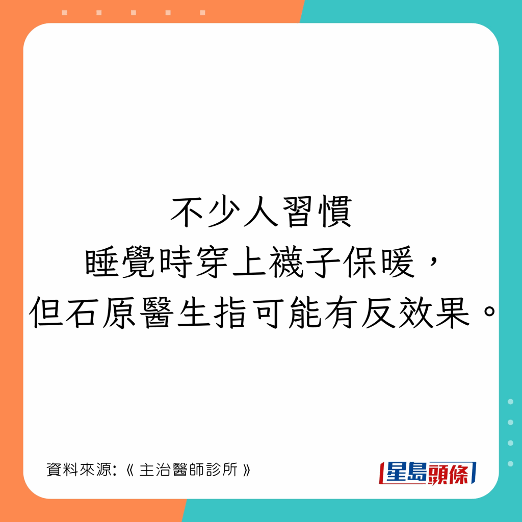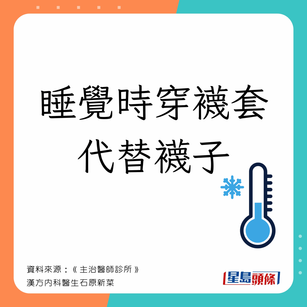 日本漢方內(nèi)科醫(yī)生石原新菜在醫(yī)學(xué)節(jié)目《主治醫(yī)師診所》(主治醫(yī)が見つかる診療所)指出,穿襪子睡覺無法保暖,反而感覺更寒冷,用1對象比穿襪更有效,另她亦推介穿腰封御寒。