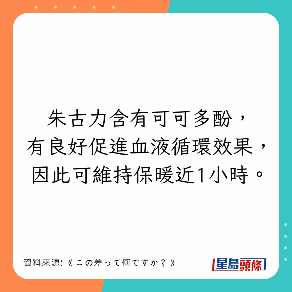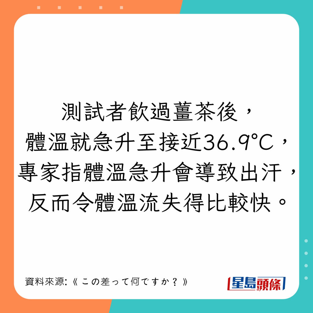 日本節(jié)目《この差って何ですか?》曾找真人實測飲用6款熱飲保暖的效果,包括咖啡、紅茶、綠茶、朱古力、姜茶及甘酒的暖身效果。體溫回落至36.2°C的時間愈長,則代表該款飲品的保暖效果愈長。