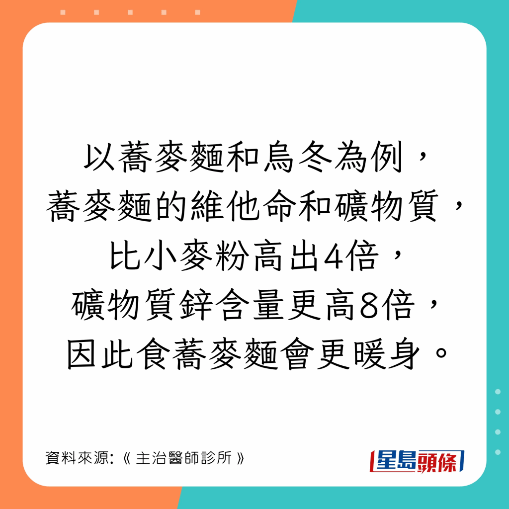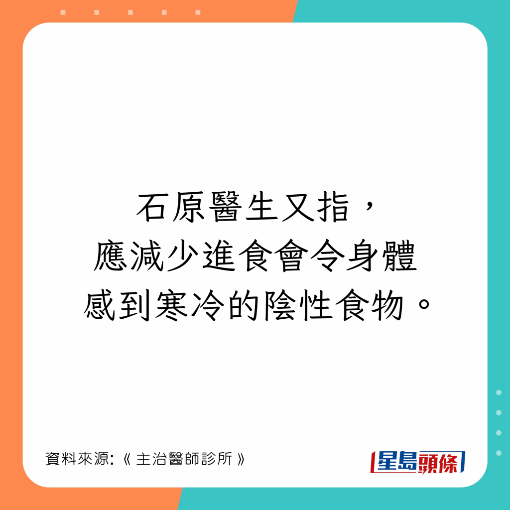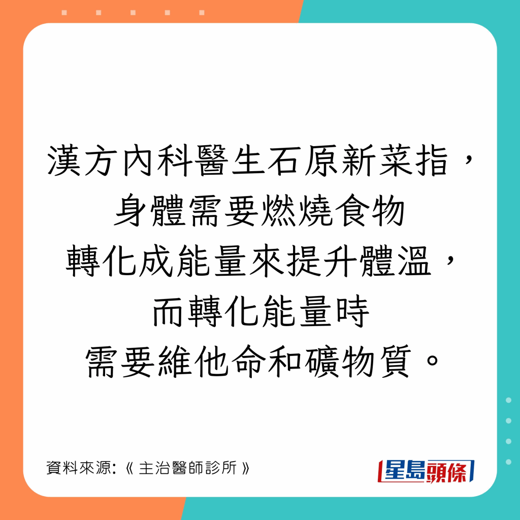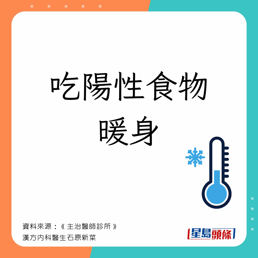 日本漢方內(nèi)科醫(yī)生石原新菜在節(jié)目《主治醫(yī)師診所》指出,冬天宜多吃陽性食物保暖,例子如下: