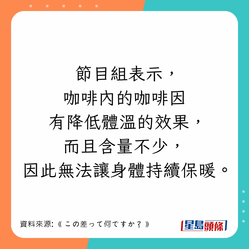 日本節(jié)目《この差って何ですか?》曾邀請6位測試者,實測飲用咖啡、紅茶、綠茶、朱古力、姜茶及甘酒的暖身效果。節(jié)目組先安排測試者坐在一間20°C的房間內(nèi),各人獲派上述其中1款熱飲,各杯飲品份量和溫度相同;飲用后不斷測量體溫,直至測試者的體溫回落至36.2°C。體溫回落至36.2°C的時間愈長,就代表該飲品的保暖程度愈持久。
