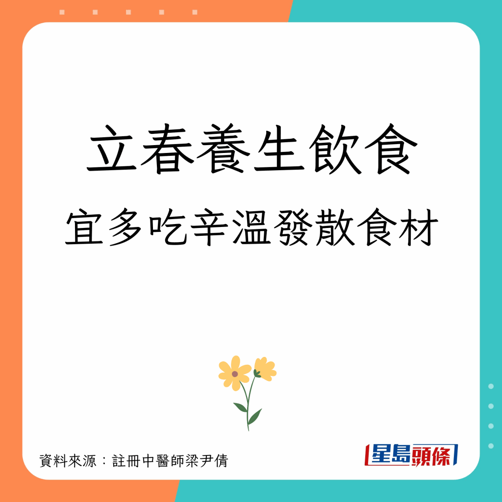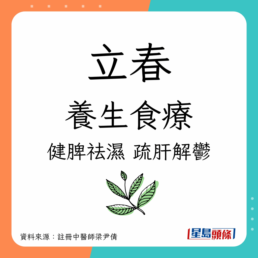 昨日(2月4日)立春,一年之中第一個(gè)節(jié)氣,容易出現(xiàn)春困、肝火盛問(wèn)題。天氣潮濕、飲食不節(jié)制,濕邪易致疲累、頭痛等都市病。注冊(cè)中醫(yī)師梁尹倩(Cinci)表示,立春養(yǎng)生重點(diǎn)是“升發(fā)養(yǎng)陽(yáng),調(diào)暢肝氣”。她推介13款食物健脾祛濕驅(qū)寒,以及3款春天養(yǎng)生食療。