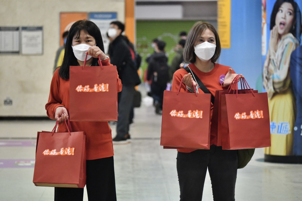 ▲工作人員向旅客派發(fā)寫有“你好,香港!”字句的福袋。