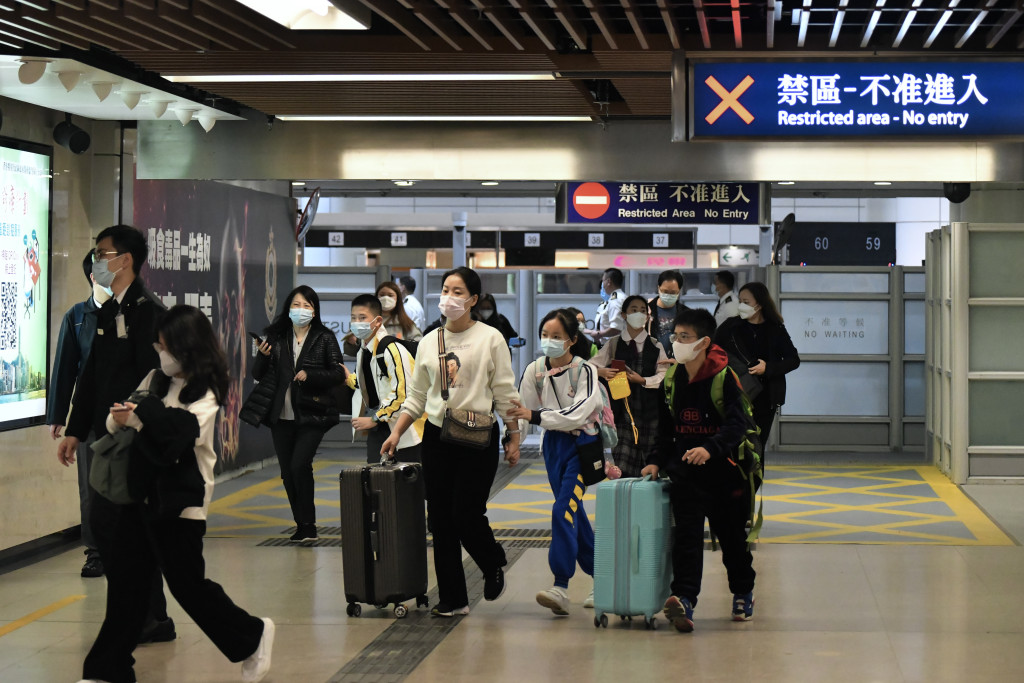 工作人員向旅客派發(fā)寫有“你好,香港!”字句的福袋。亦有跨境學(xué)童來(lái)港上學(xué),有學(xué)生似乎有英文功課未完成,坐在關(guān)口現(xiàn)場(chǎng)趕工。